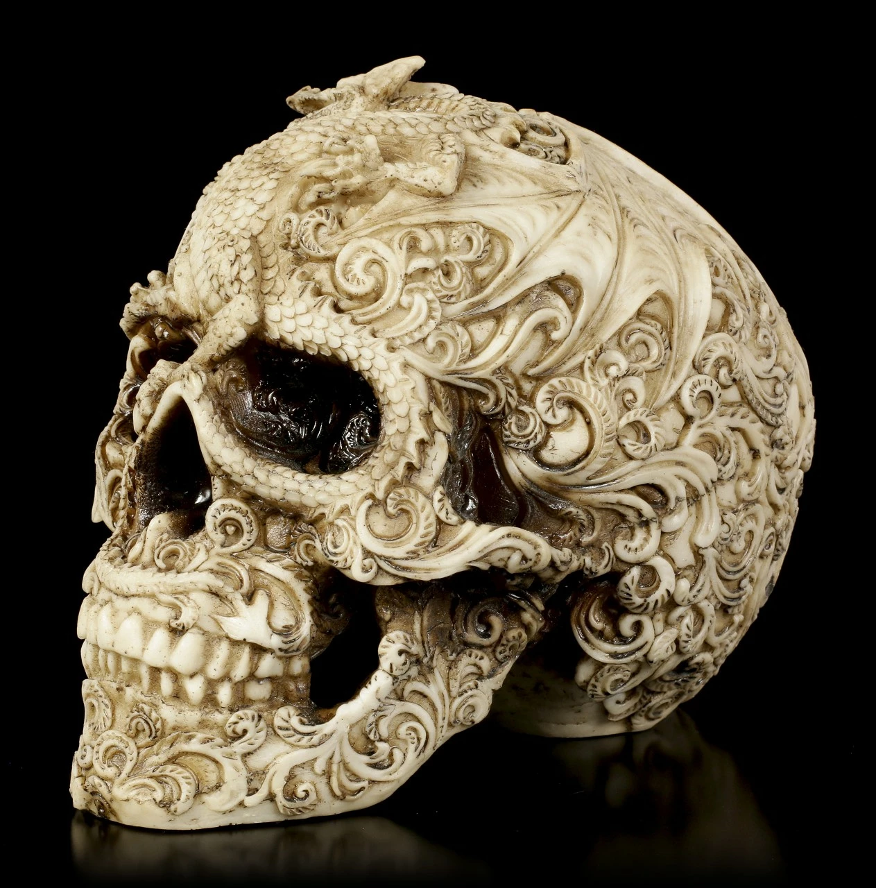 Wie geschnitzt sieht dieser fantastisch verzierte, knochenfarben handbemalte Totenschädel aus Kunststein (Polyresin) aus. Ein kleiner Drache, von dem der Kopf plastisch auf dem Totenkopf zu sehen ist, windet sich über den Schädel. Bereits im Barock wurden so reich verzierte Totenschädel auch als Tafelschmuck bei opulenten Festmahlen verwendet, nun wird der 15,5 cm hohe, 12,5 cm breite und 19 cm tiefe Totenschädel Cranial Drakos mit dem Drachenrelief eventuell auch bei Ihnen zur fantasievollen Tischdeko.
