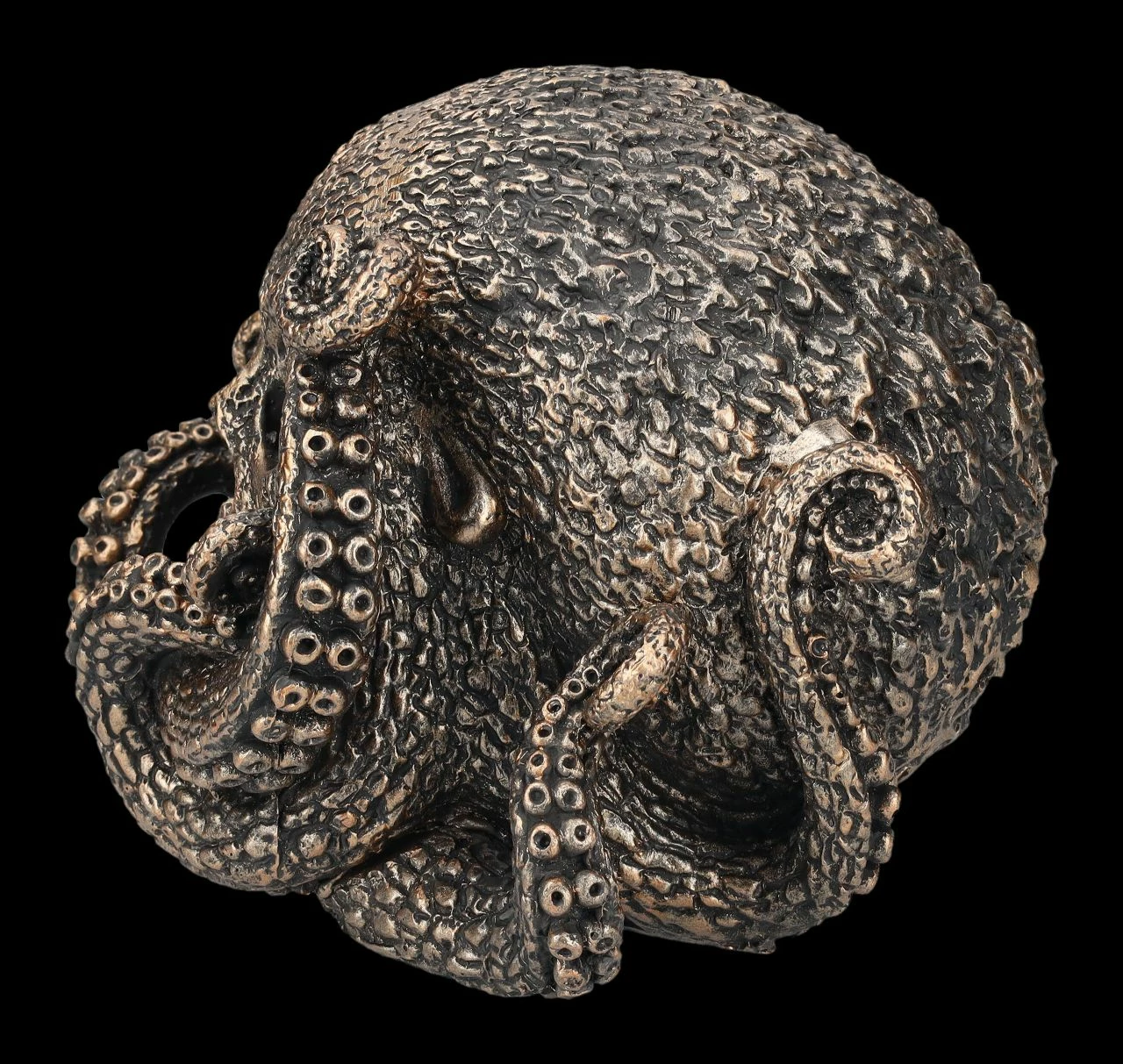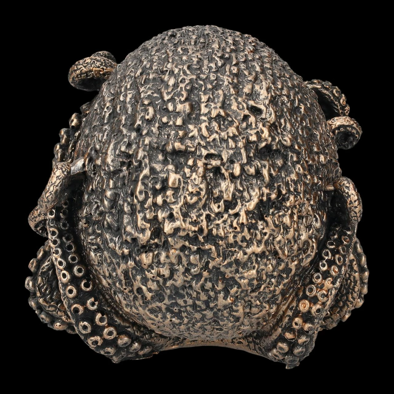 Zahlreiche Tentakel scheinen aus diesem Totenschädel zu wachsen. Fans von Lovecrafts Geschichte über das uralte Wesen Cthulhu, das vor Millionen von Jahren von den Sternen auf die Erde kam und in den Tiefen des Ozeans gefangen gehalten wird, werden von der Deko begeistert sein. Der 13 cm hohe, 14 cm breite und 15 cm tiefe Cthulhu Krakenschädel mit dem Gruseleffekt wurde detailreich aus Kunststein (Polyresin) gefertigt und wunderbar bronziert Für alle Cthulhu-Fans ist er ein cooles Geschenk.