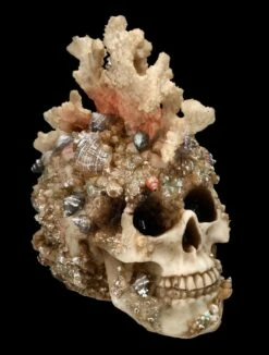 Als wäre er mit Korallen bewachsen aus den unendlichen Tiefen eines Atolls aufgetraucht, so wirkt dieser unglaubliche Totenkopf. Er wurde aufwendig und detailreich aus Kunststein (Polyresin) gefertigt und von Hand bemalt. Der 17 cm hohe, 10,5 cm breite und 18 cm tiefe Totenschädel ist nicht nur eine Wahnsinnsdeko, sondern wird selbst bei einer wilden Horror Motto Party oder bei einem Halloween-Event zum sofortigen Blickfang.