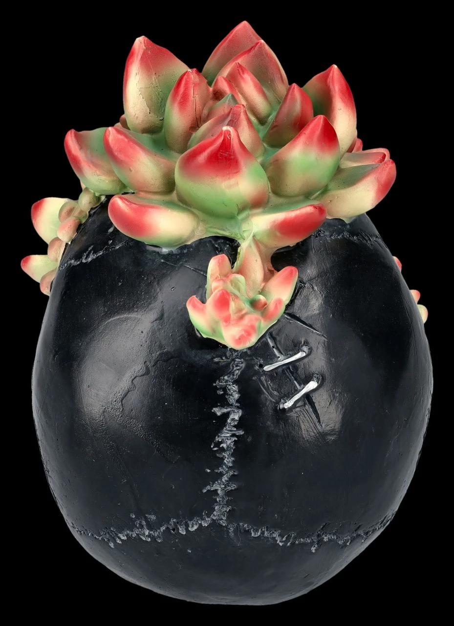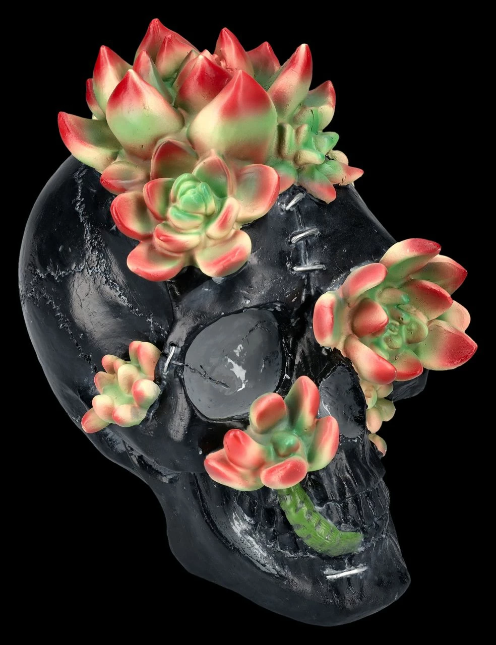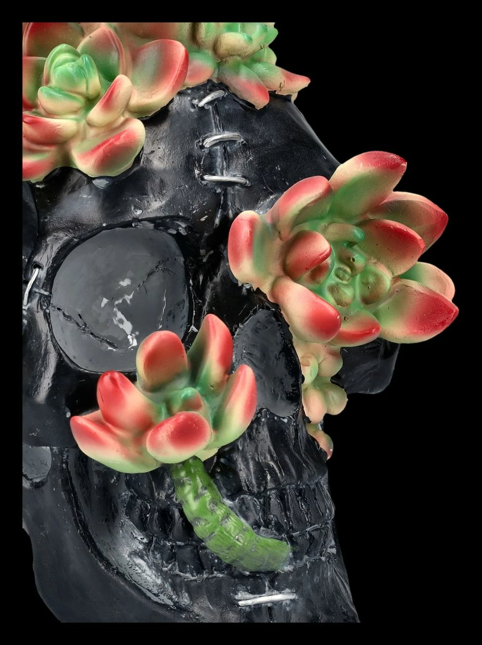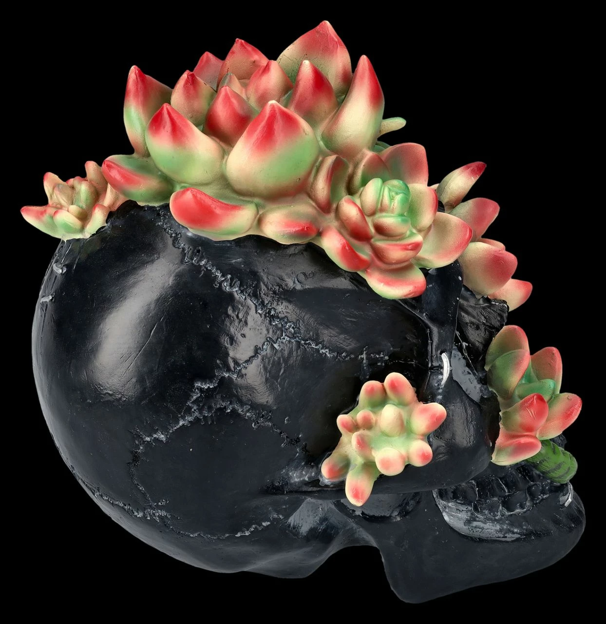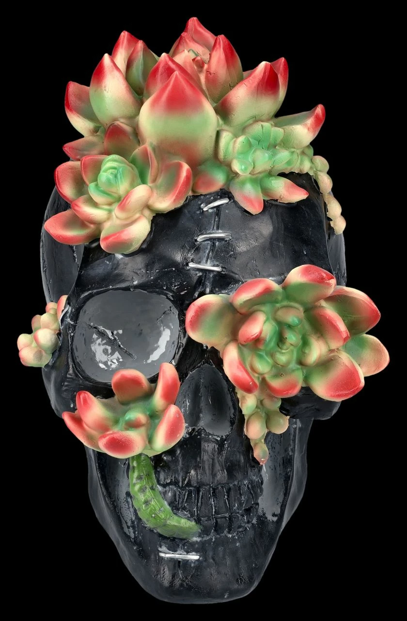 Für alle, die wenig Zeit für die Pflege ihrer Pflanzen haben, ist diese Totenkopf Figur die richtige Deko. Es sieht aus, als würden bunt gefärbte echte Sukkulenten aus einem schwarzen Totenkopf wachsen. Die Totenkopf-Figur mit den realstisch wirkenden Sukkulenten wurde detailreich aus handbemaltem Kunststein (Polyresin) gefertigt. Sie ist 19 cm hoch, 14 cm breit und 19 cm tief und selbst auf einer Blumenbank ein sofortiger Blickfang. Der Totenkopf mit den Sukkulenten ist aber auch ein witziges Geschenk für alle, die keinen ‚grünen Daumen‘ haben.
