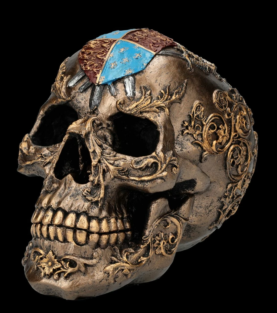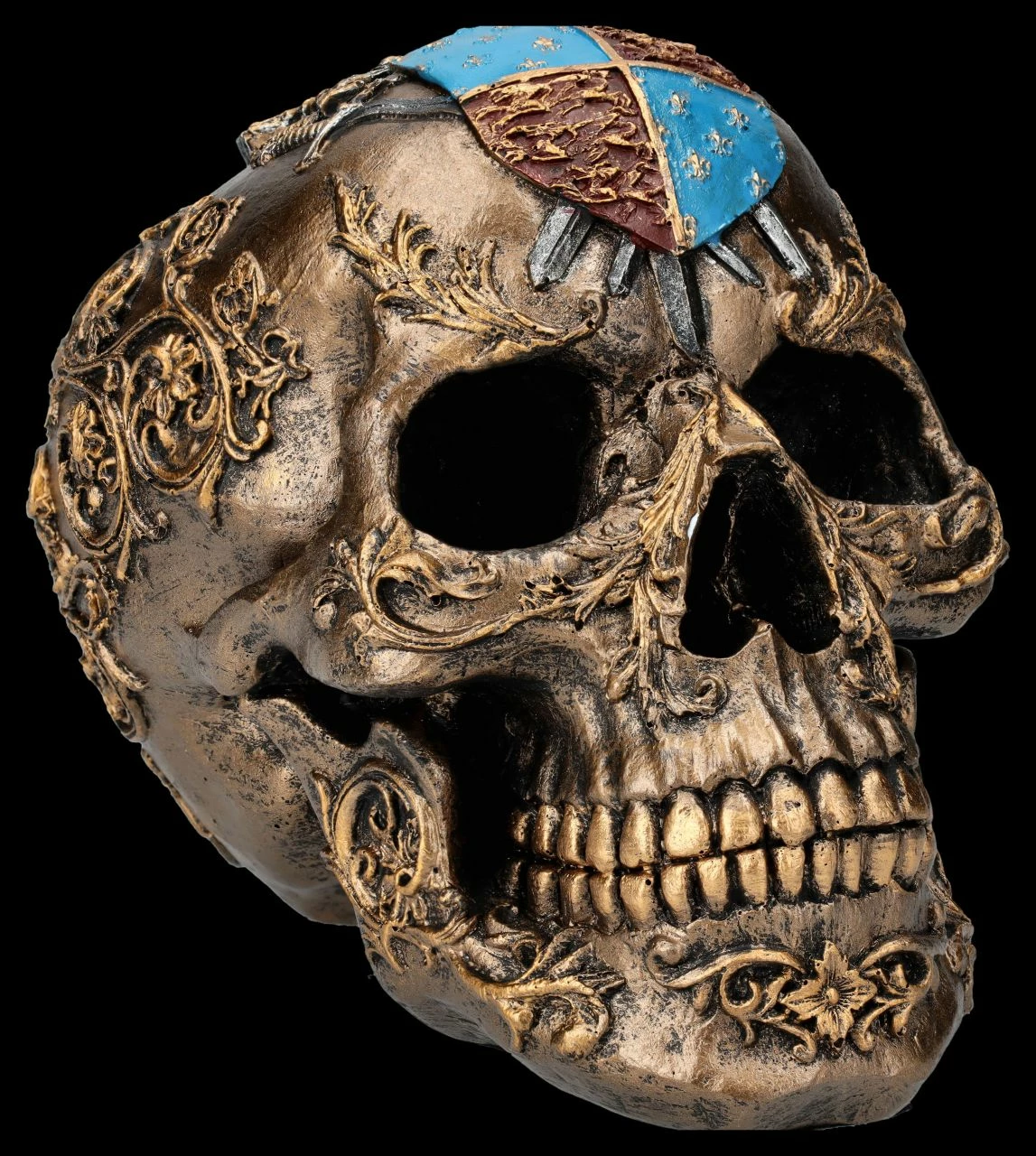 Nicht nur das Wappen eines Ritters über den gekreuzten Schwertern auf der Schädelbasis, auch die übrigen beinahe barocken Verzierungen machen aus diesem Totenkopf etwas ganz Besonderes. Der 13,5 cm hohe, 11 cm breite und 16 cm tiefe exquisite Totenkopf mit dem Ritter-Wappen ist detailreich aus Kunststein (Polyresin) entstanden und wurde sorgfältig von Hand bemalt. Sammler werden begeistert sein. Der exquisite Totenkopf ist aber auch für einen Ritter ein dekoratives Geschenk.