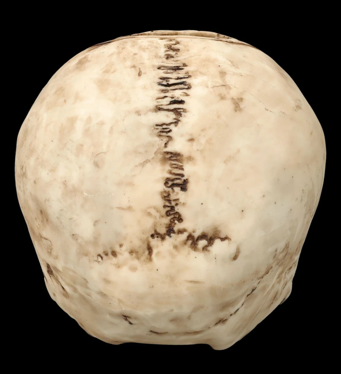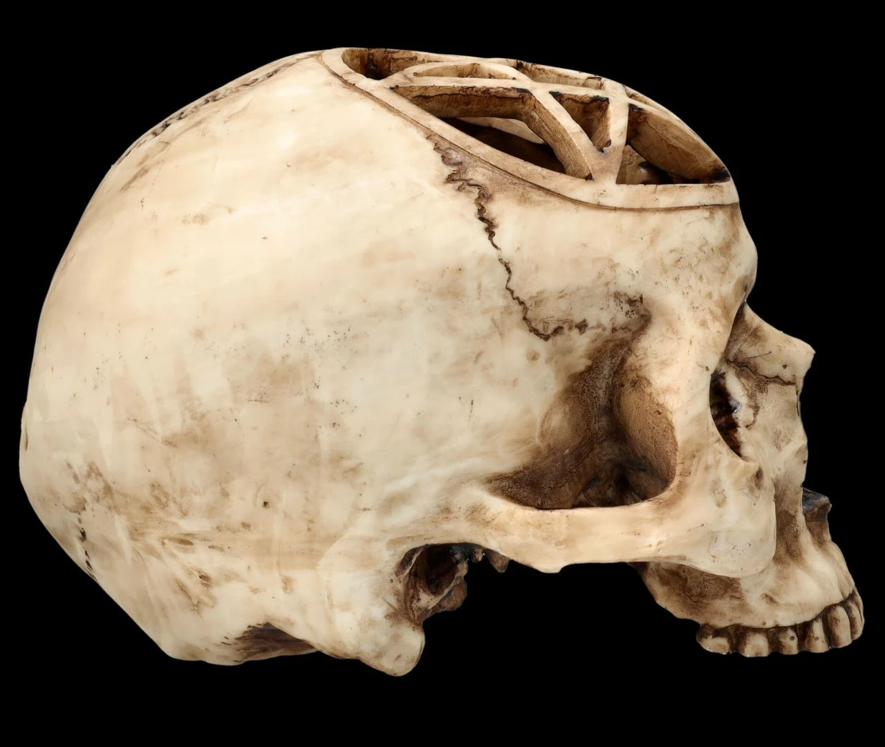 Der mystische Totenkopf ohne Unterkiefer hat auf der Schädeldecke ein großes Pentagramm, das wo wirkt, als wäre es mit viel Mühe herausgeschnitzt. Mit diesem Pentagramm, das zu den mächtigsten Schutzsymbolen gehört, ist der knochenfarben und sehr realistisch handbemalte und detailreiche Totenkopf aus Kunststein (Polyresin) für alle spirituellen Rituale bestens geeignet. Der Ritualschädel ist 12,5 cm hoch, 13 cm breit und 18 cm tief. Er wird auf jedem Altar, aber auch einfach auf dem Tisch oder dem Sideboard zu einem außergewöhnlichen Blickfang.