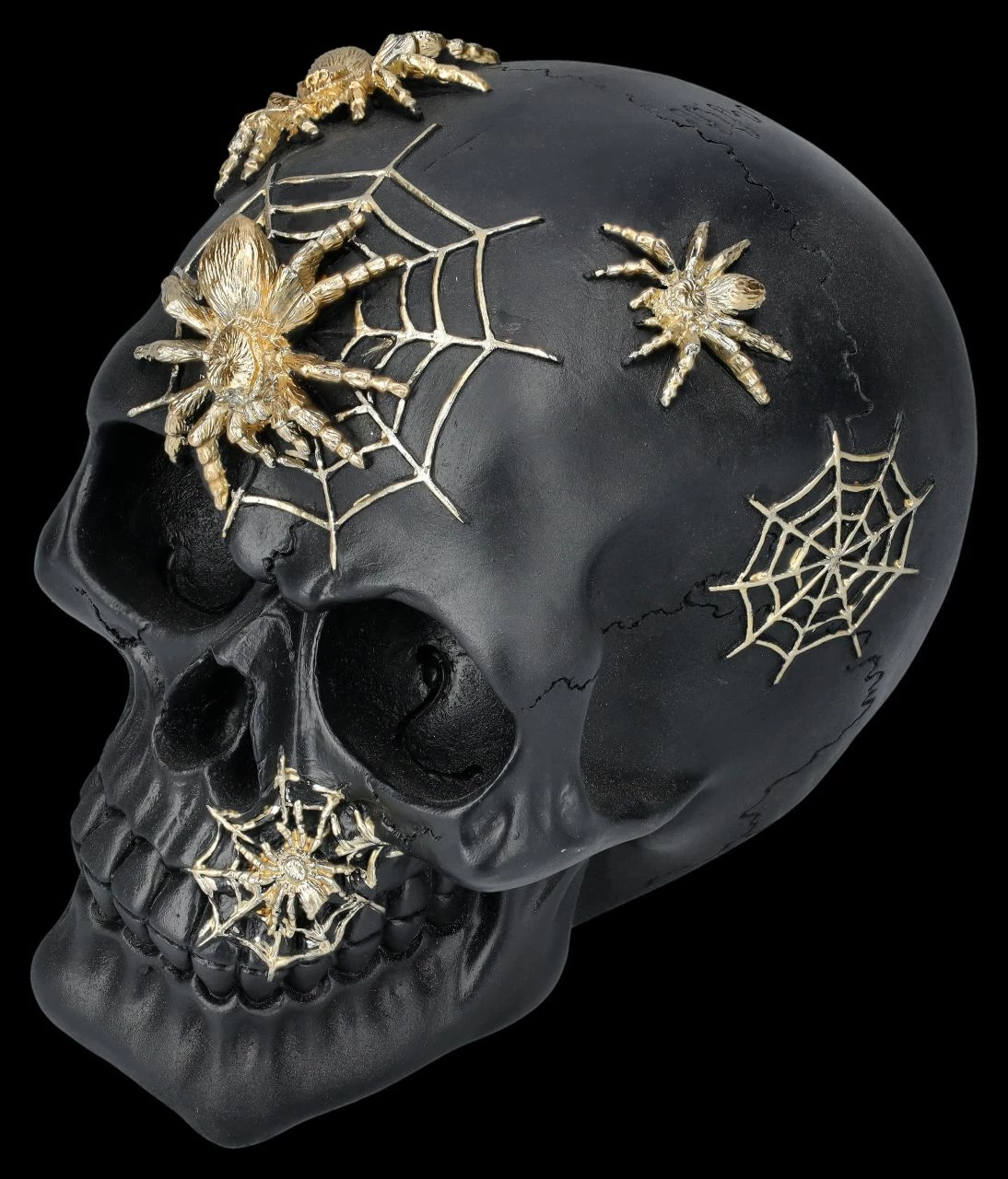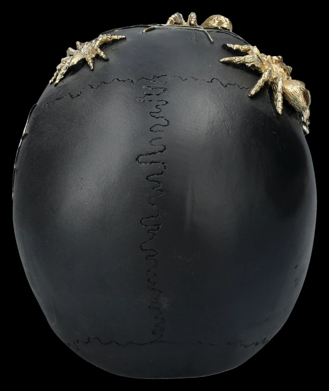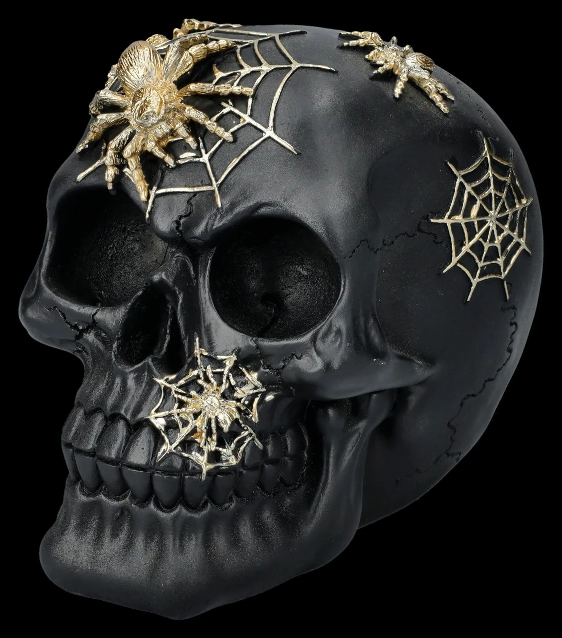 Goldene Spinnen spannen ihr Netz auf diesem schwarzen Totenkopf. Der Schädel ist aus handbemaltem Kunststein (Polyresin) und wirkt ausgesprochen edel. Der kunstvolle schwarze Totenkopf mit den goldenen Spinnen ist 11,5 cm hoch, 11 cm breit und 15 cm tief und wird garantiert zum faszinierenden Blickfang in einer Schädel-Sammlung