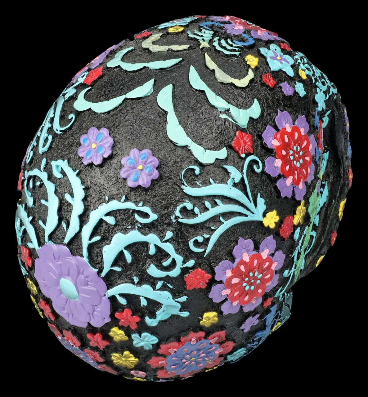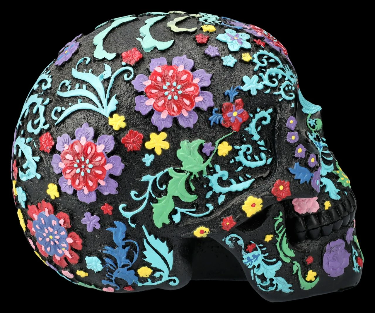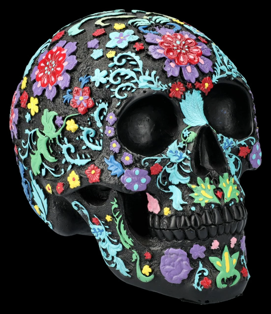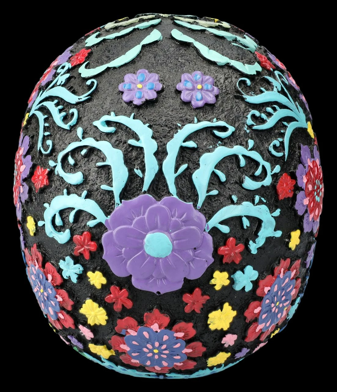Der schwarze Totenkopf ist über und über mit bunten, fröhlichen Blumen und Blütenranken verziert. Der künstlerische Schädel mit dem bunten Blumenmuster im Hippie-Style ist auf jeden Fall eine zwar ungewöhnliche, aber zumindest sehr auffällige und fröhliche Dekoration. Der ungewöhnliche, aber sehr dekorative Totenkopf stammt aus der Summit Collection. Er ist detailreich aus handbemaltem Kunststein (Polyresin) gefertigt und 16 cm hoch, 13 cm breit und 20 cm tief. Der schwarze Totenkopf mit dem bunten Blumenmuster ist sicher auch für Sammler ein fantasievolles Geschenk.