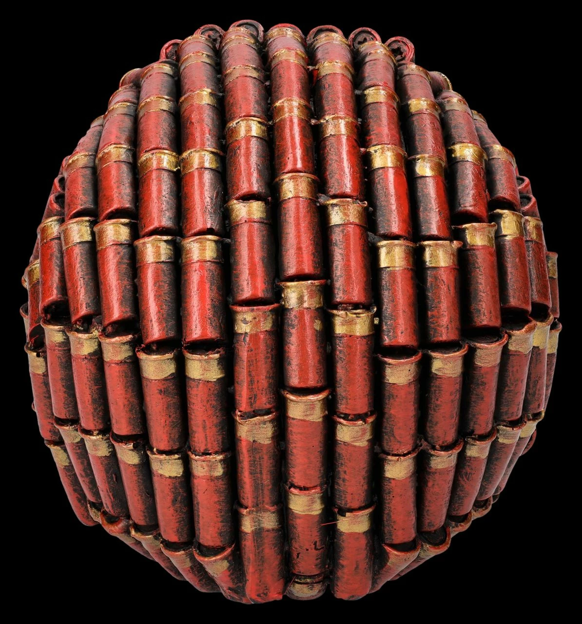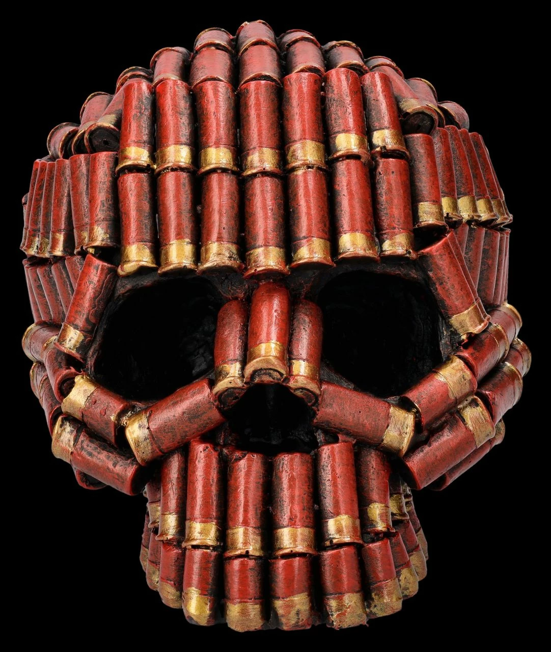 Da scheint jemand alle Patronenhülsen wieder aufgesammelt zu haben, um den unglaublichen Schädel damit zu schmücken. Nun, vielleicht gehörte dieser Schädel mal einem berühmt-berüchtigten Schützen mit dem Namen ‚Shotgun‘ – wer weiß das schon…. Der 11,5 cm hohe, 12 cm breite und 17 cm tiefe Totenkopf ist detailreich aus handbemaltem Kunststein (Polyresin) gefertigt und wird in jedem Regal, auf dem Sideboard oder dem Schreibtisch für zahlreiche Fragen sorgen.