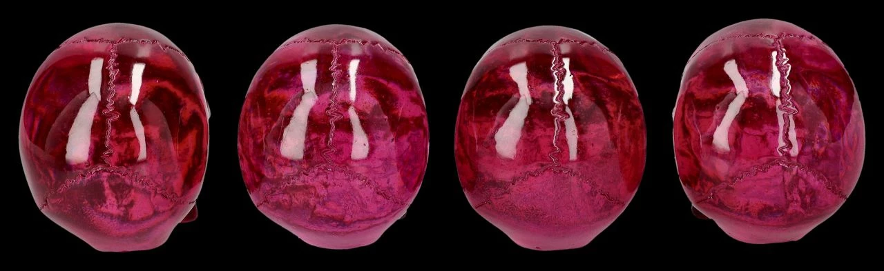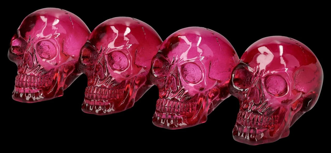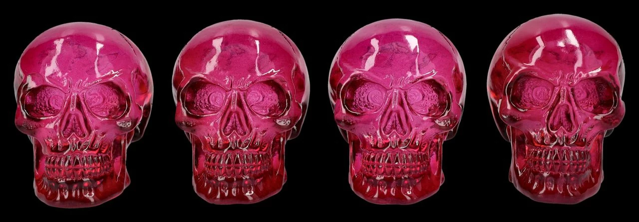 Ein paar chice Totenköpfe, die man dekorativ im Regal oder auf dem Tisch verteilen kann, oder auch mit Freunden teilen könnte. Beinahe gläsern wirken die bordeauxroten kleinen Totenköpfe durch die durchsichtige Optik. Die je 5 cm hohen, je 4 cm breiten und je 6,5 cm tiefen kleinen Schädel sind aus Kunststein (Polyresin) und wurden von Hand poliert. Die dekorativen Totenkopf Figuren kommen im 4er-Set.