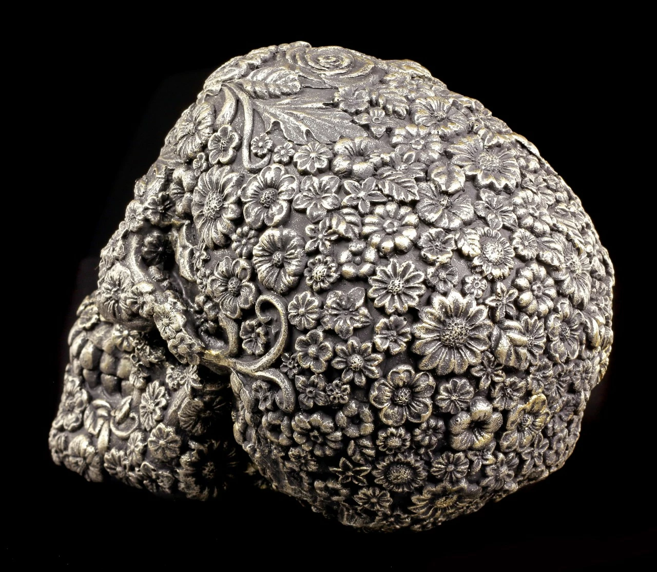 Der Totenkopf mit dem floralem Muster wurde aus Kunststein geschaffen und im Anschluss schwarz handbemalt. Der schwarze Schädel ist mit unzähligen Blumen, Blüten und Blättern geschmückt. Jede einzelne Blüte wurde individuell ausgearbeitet.
