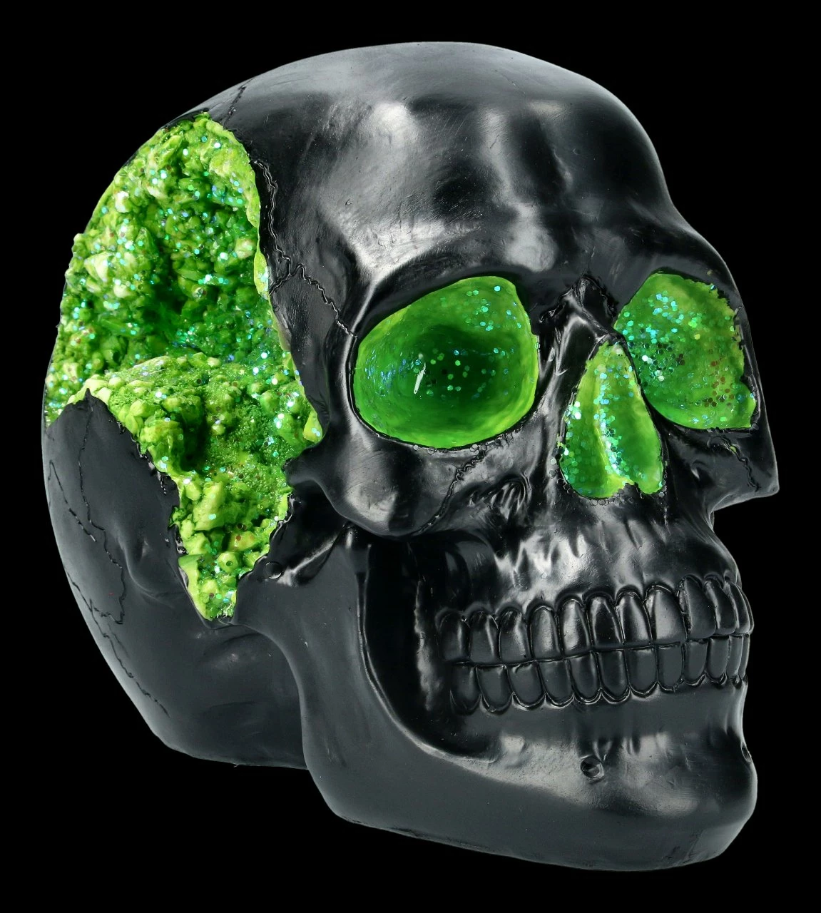 Magisch funkeln grüne Kristalle aus den Augenhöhlen, der Nasenhöhle und der rechten Schläfe des schwarzen Schädels. Der Geode Skull ist aus detailliert handbemaltem Kunststein (Polyresin) gefertigt und 14 cm hoch, 12 cm breit und 19 cm tief. Schlicht und klar ist dieser Schädel eine coole Deko für Ihren Schreibtisch.