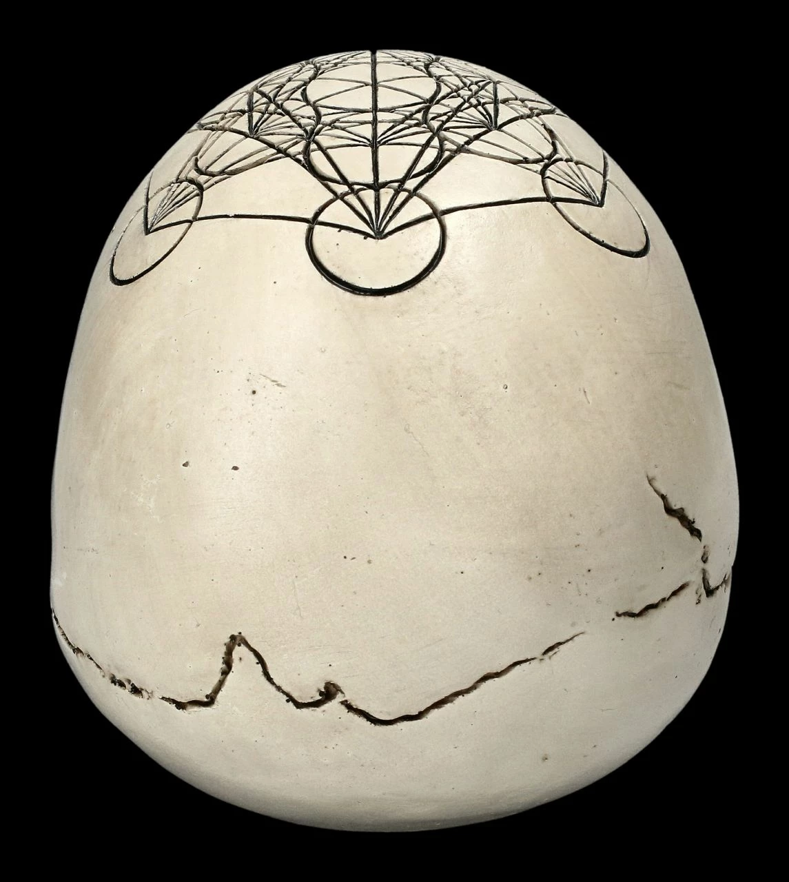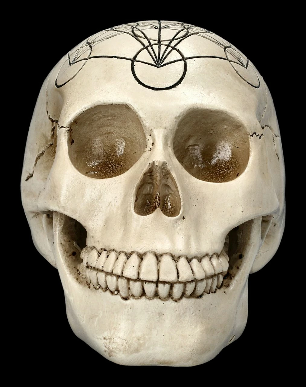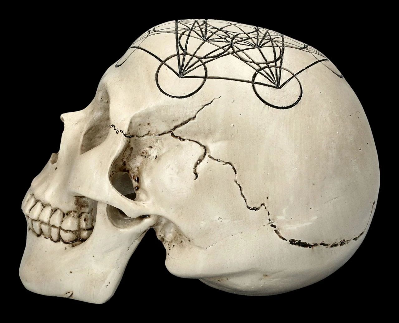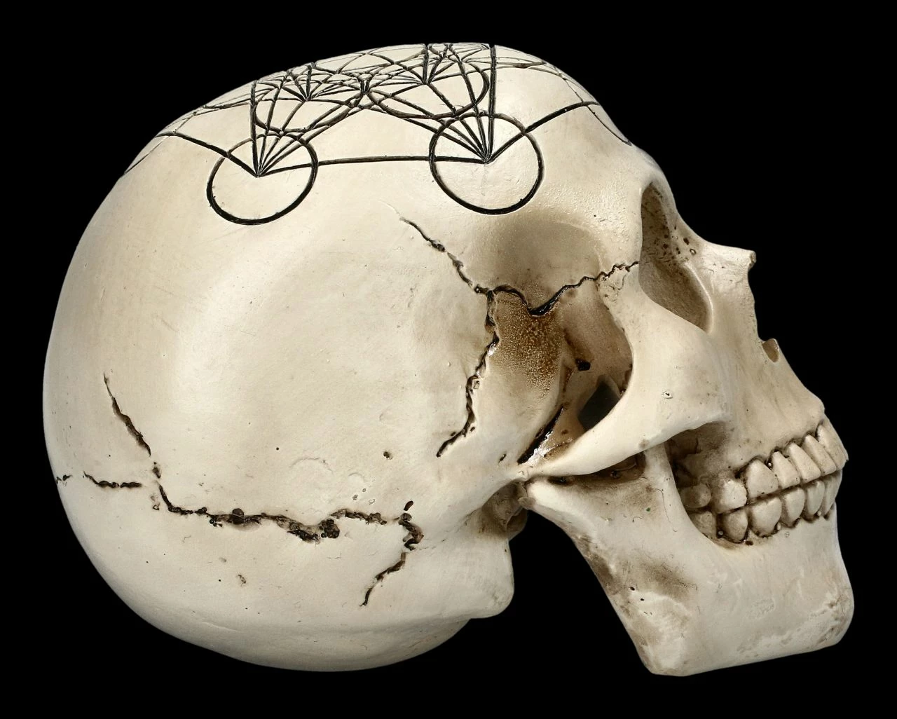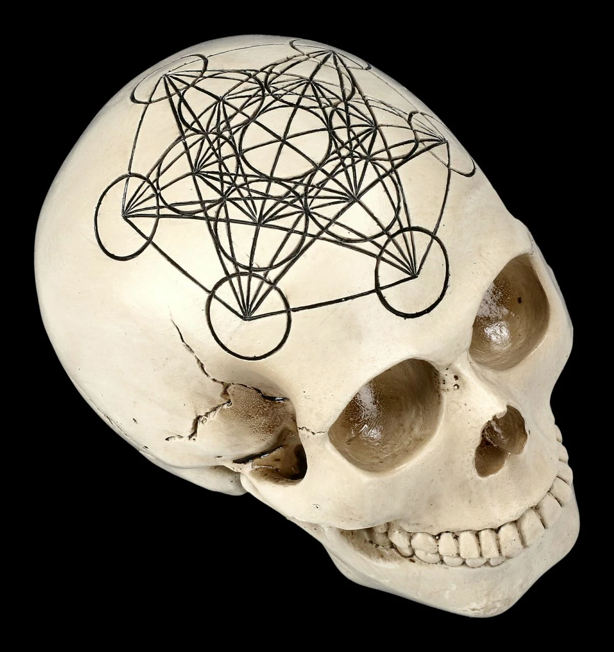 Die Heilige Geometrie gilt als Fundament für alles Lebendige. Jedes Symbol hat seine eigene Wirkung und Energie, die genutzt werden kann, um positive Gefühle und auch Ideen zu fördern. So steht der Metatron Würfel als Symbol für Glück und verbindet die Abbilder der fünf platonischen Körper Tetraeder, Hexaeder, Oktaeder, Dodekaeder und dem Ikosaeder. Der Würfel gilt als Schöpfungsmuster des Universums. Auf dem Haupt dieses in natürlichen Knochen-Farben handbemaltem Totenkopf aus Kunststein (Polyresin) ist der magische Metatron Würfel zu sehen. Der faszinierende Totenkopf mit der Höhe von 12,5 cm, der Breite von 11,2 cm und der Tiefe von 16 cm ist eine ungewöhnliche Dekoration für Ihr Heim oder Studio. Weitere Totenköpfe mit Formen aus der Heiligen Geometrie finden Sie in unserem Shop.