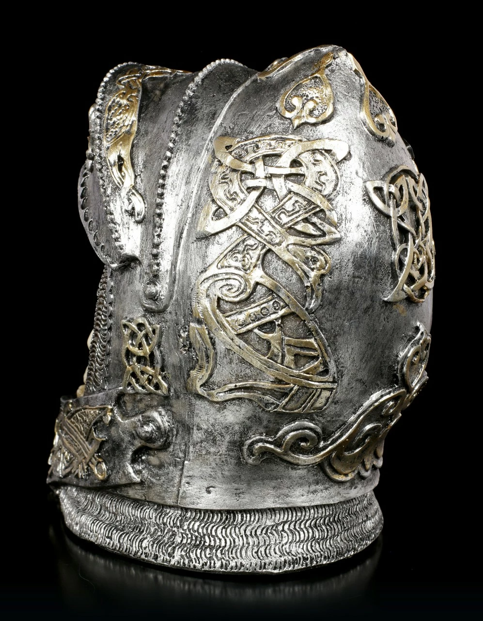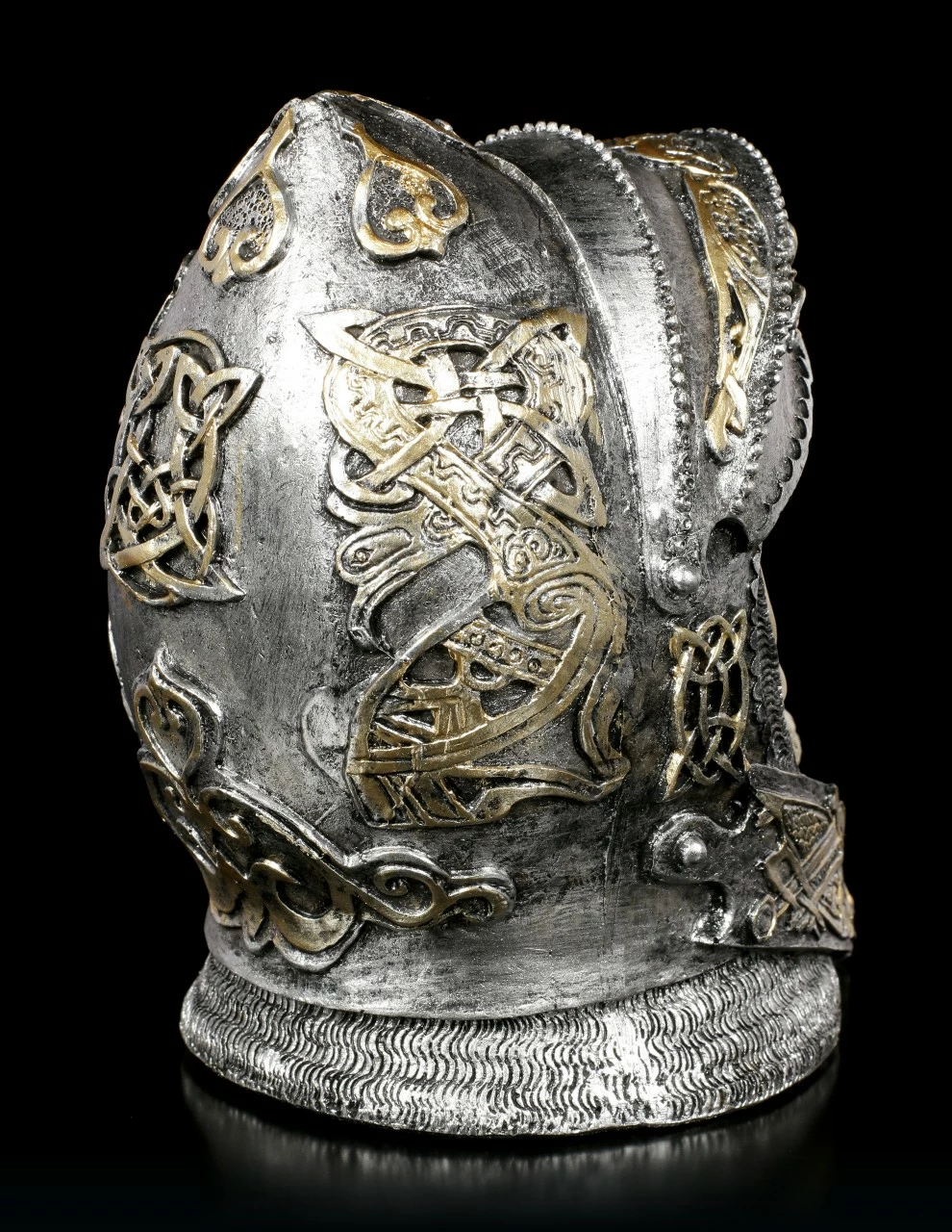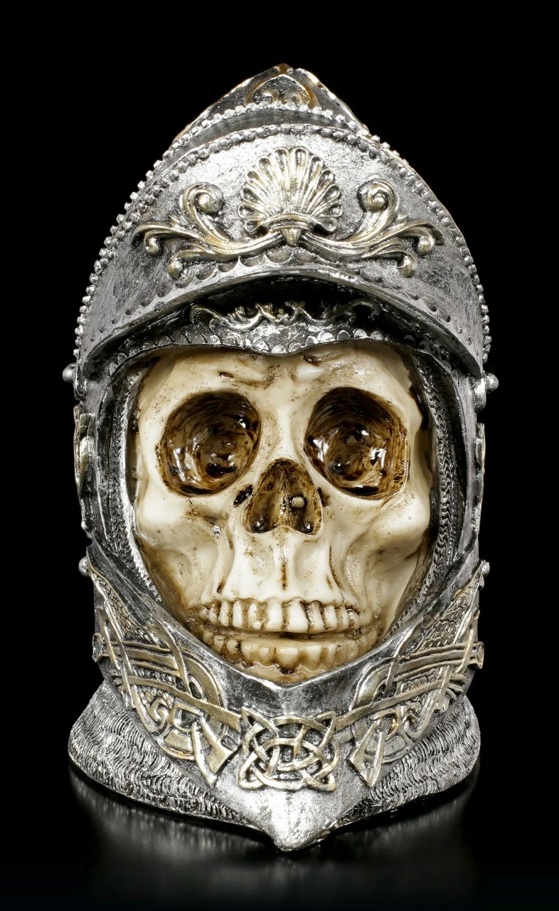 Der Schädel des tapferen Ritters trägt noch den reich verzierten Helm, mit dem er in die Schlacht gezogen ist. Das offene Visier lässt den Blick auf den blanken Knochen zu. Der handbemalte Totenkopf aus Kunststein (Polyresin) sollte in keiner Schädelsammlung fehlen.