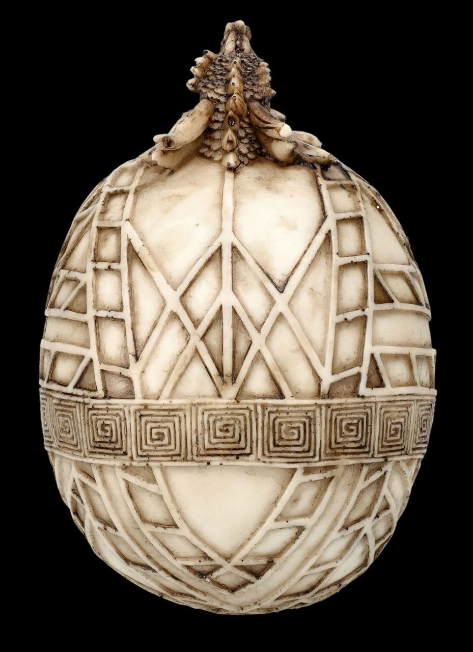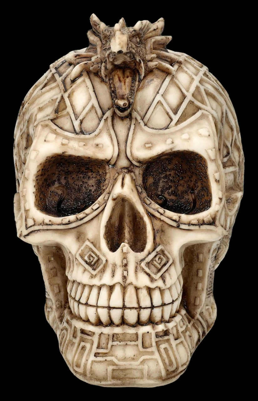 Der Kopf des keltischen Drachens prangt auf der Stirn dieses prächtigen, mit mystischen Schnitzereien verzierten Totenkopfes Er ist sehr detailreich aus handbemaltem Kunststein (Polyresin) gefertigt und ist 14 cm hoch, 9 cm breit und 15 cm tief. Der dekorative und kraftvolle Totenkopf mit dem keltischen Drachen ist nicht nur eine perfektes Geschenk für Liebhaber der keltischen Kultur, er ist auch eine tolle Ergänzung für eine Totenkopf-Sammlung.