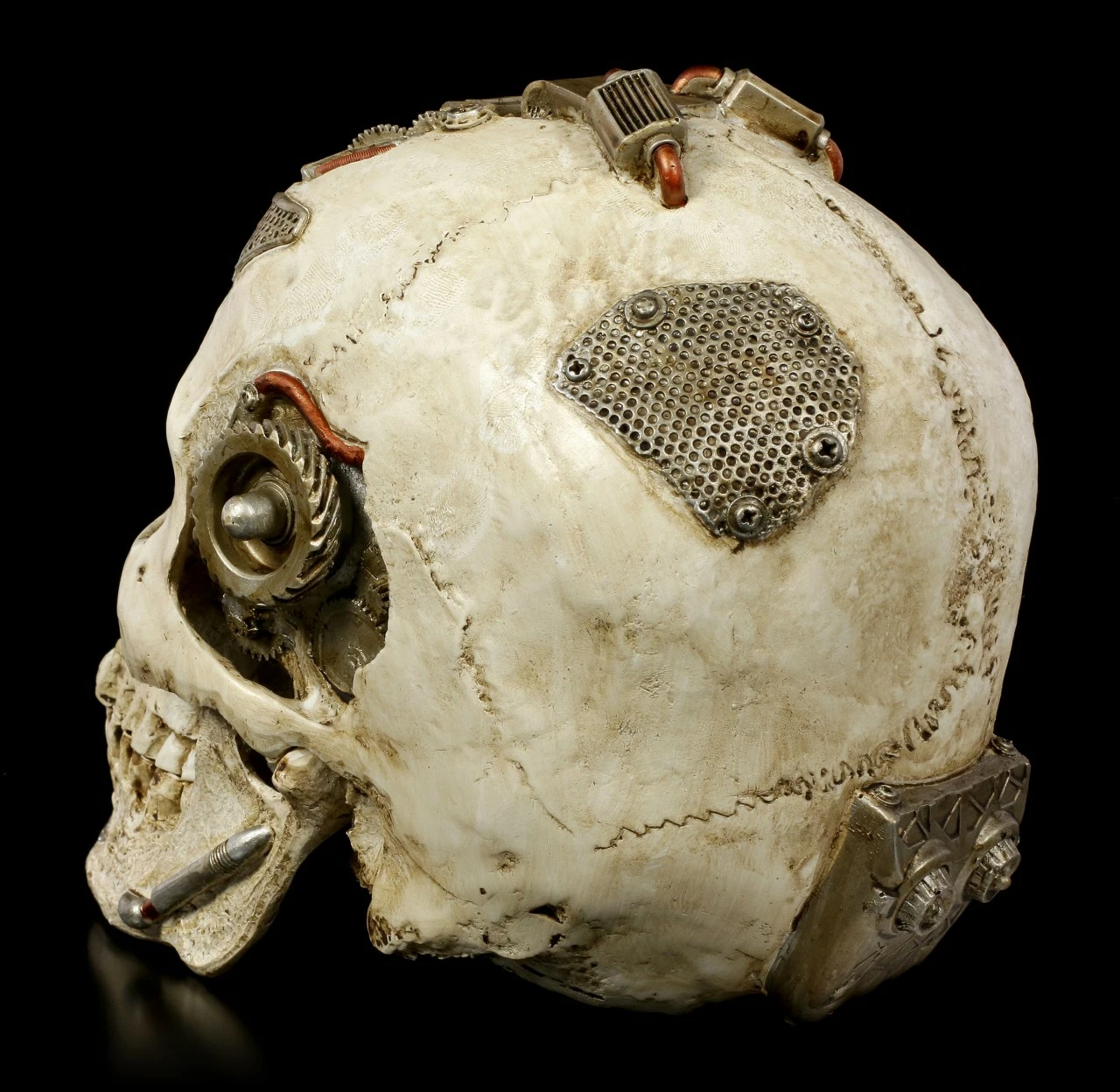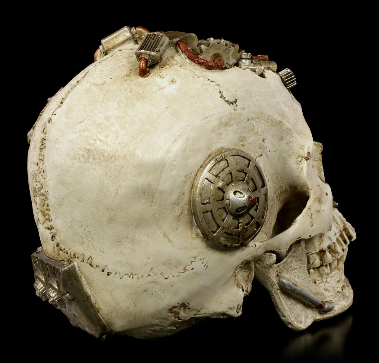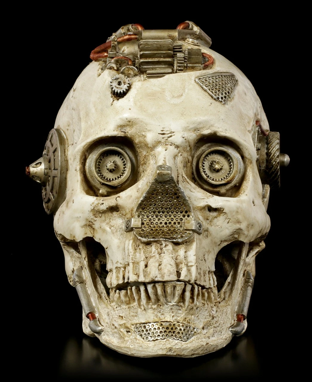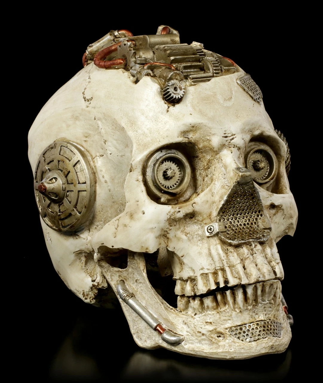 Mensch, Maschine, KI? Der Totenkopf Maschine Skull CY515 ist eine Symbiose zwischen Motor und Schädel. Der handbemalte Schädel aus Kunststein (Polyresin) hat zahlreiche maschinelle Details integriert. Wenn Sie auf der Suche einem außergewöhnlichen Totenkopf sind, ist CY515 genau das Richtige für Sie.