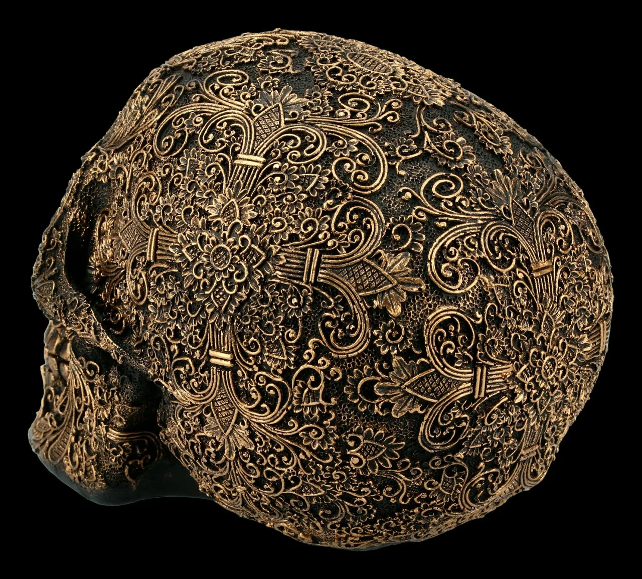 Sehr aufwendig mit feinen Ornamenten verziert, sieht dieser dekorative Deko Totenkopf wie ein außergewöhnlicher Schmuckgegenstand aus. Der Totenkopf ist sehr detailreich aus Kunststein (Polyresin) gefertigt und sorgfältig von Hand bemalt. Mit seiner Höhe von 13 cm, der Breite von 12 cm und der Tiefe von 17 cm ziert er jeden Schreibtisch oder jedes Regal und wird überall die Aufmerksamkeit Ihrer Besucher auf sich ziehen.