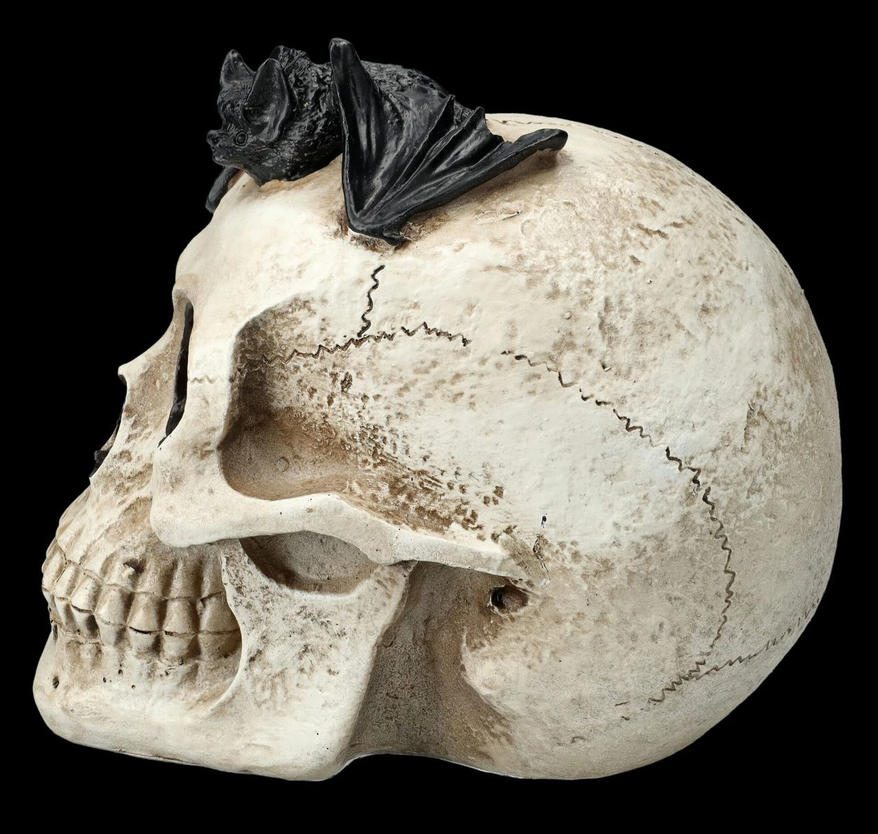 Eine sehr realistisch aussehende Fledermaus hat sich auf dem knochenfarbenen Schädel niedergelassen. Der 16,5 cm hohe, 12,5 cm breite und 18,5 cm tiefe Totenkopf mit der Fledermaus ist detailreich aus handbemaltem Kunststein (Polyresin) gefertigt. Er ist eine magische Deko für jedes Ritual. Aber der Schädel ist auch eine fantastische Ergänzung für eine Totenkopf-Sammlung damit auch ein perfektes Geschenk.
