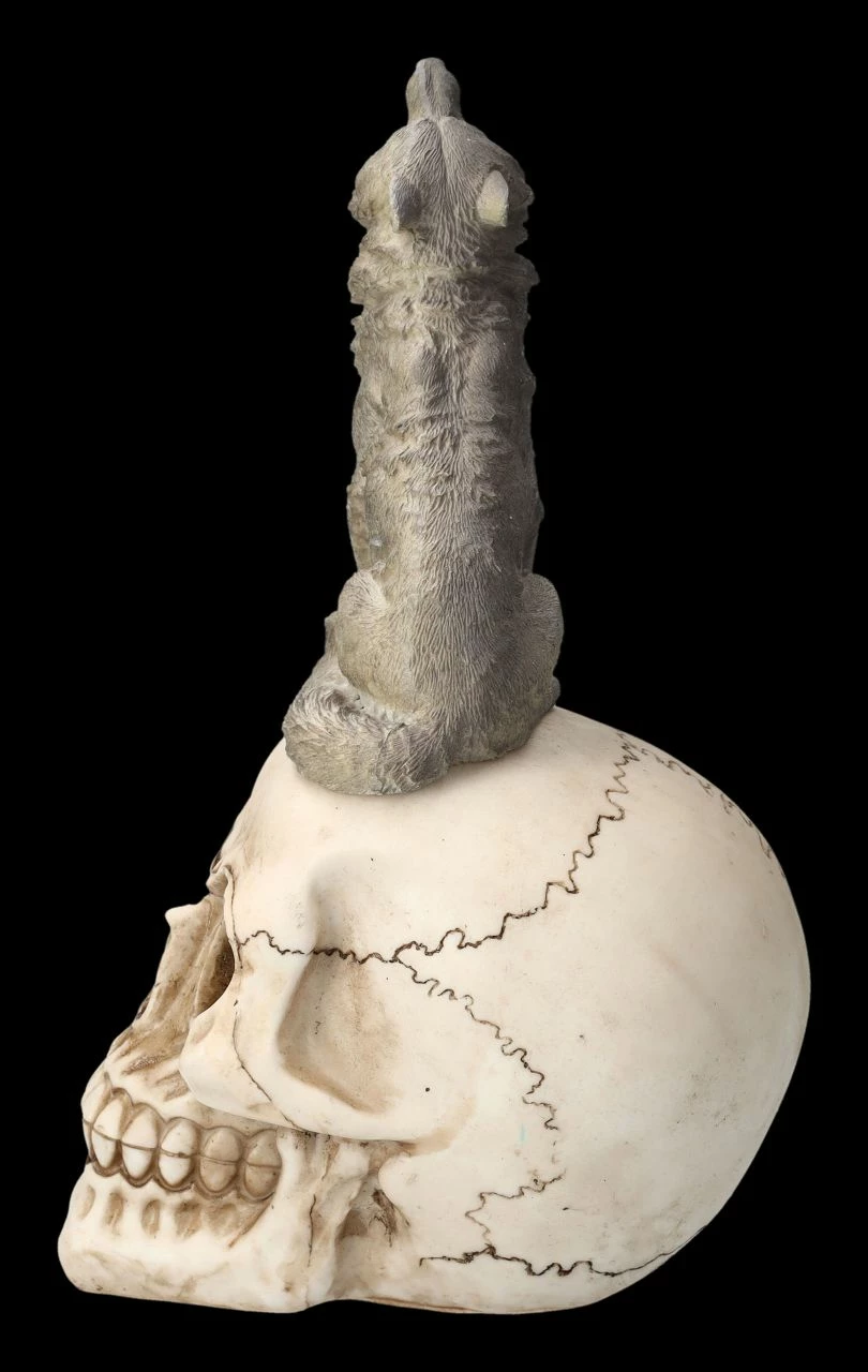 Ein grauer Wolf sitzt heulend auf dem grinsenden Totenkopf. Lediglich die rötlichen Augen und die Zunge des Wolfes geben dieser fantasievollen Figur mit dem knochenfarbenen Schädel und dem grauen Wolf etwas Farbe. Der handbemalte Schädel mit dem heulenden Wolf wurde detailreich aus Kunststein (Polyresin) gefertigt. Mit der Höhe von 24 cm, der Breite von 11 cm und der Tiefe von 15 cm wird er bei jeder Halloween Feier oder Horror Party zum garantierten Blickfang. Schädel-Sammler und Wolf-Freunde würden sich aber auch über das seltsame Geschenk freuen.