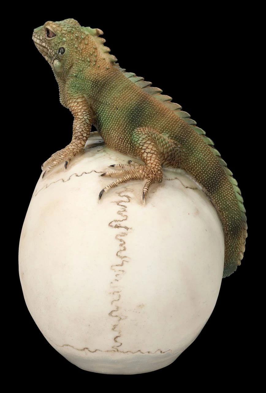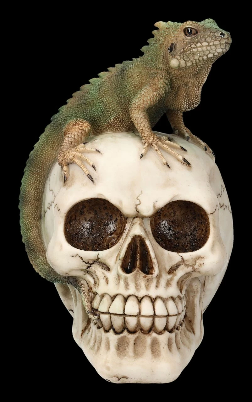 Ein Leguan nutzt offenbar den grinsenden knochenfarbenen Schädel als perfekt erhöhten Ort, um die ersten wärmenden Sonnenstrahlen einzufangen. Die Dekofigur mit dem wunderbar detailreich und natürlich gestalteten Leguan auf dem Schädel wurde aus Kunststein (Polyresin) gefertigt. Der Totenkopf mit dem Leguan wurde von Hand bemalt und ist mit der Höhe von 18 cm, der Breite von 12 cm und der Tiefe von 15 cm ein toller Blickfang für jeden Schreibtisch. Schädel-Sammler werden sich aber auch über das coole Geschenk freuen