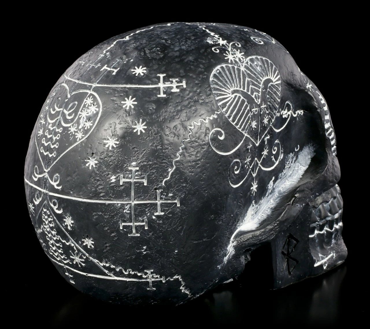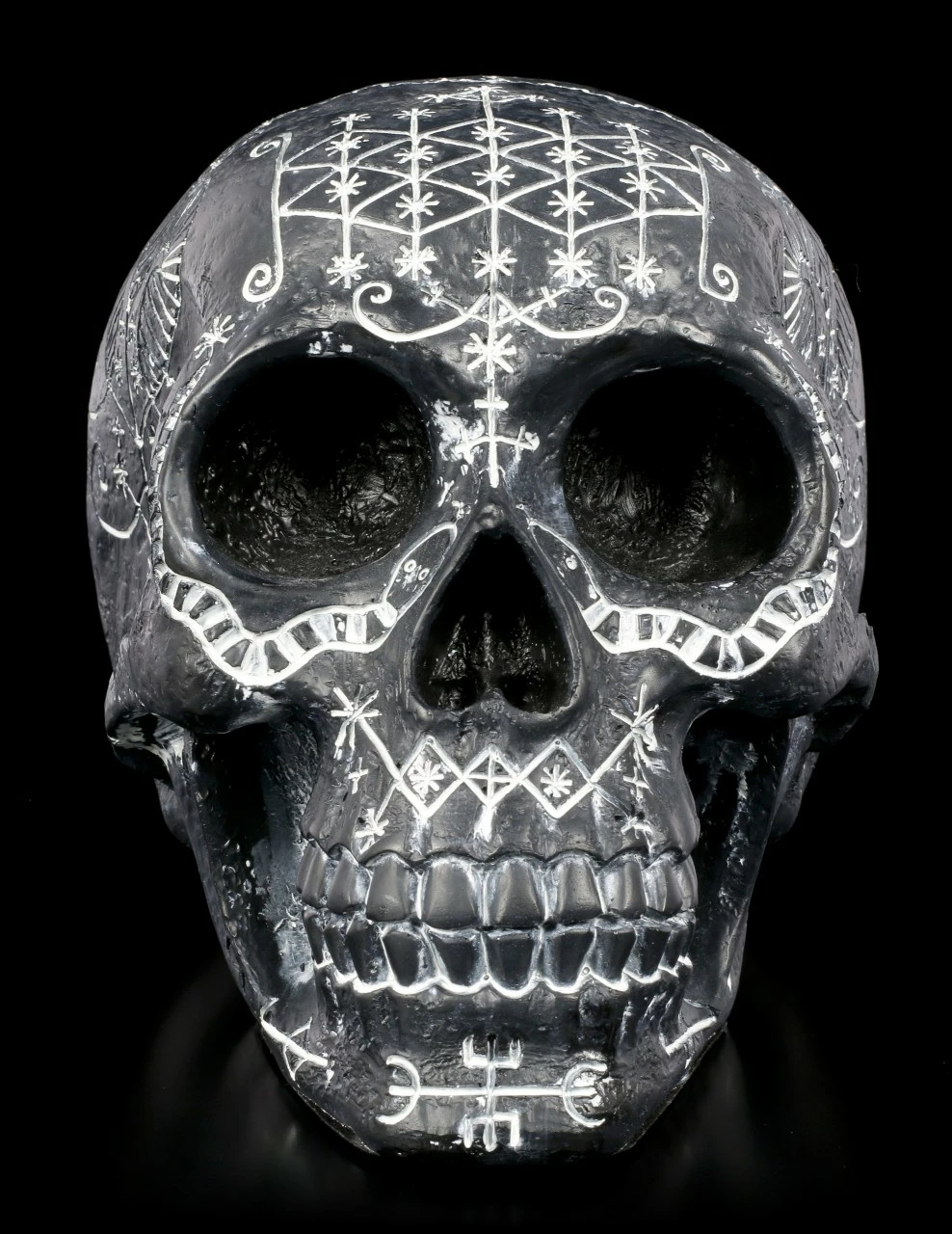 Der schwarze Totenschädel wirkt durch die weißen mystischen Symbole höchst geheimnisvoll. Was die wohl bedeuten? Der Totenkopf aus handbemaltem Kunststein (Polyresin) ist ein stilvolles Dekorationselement – nicht nur für Halloween.