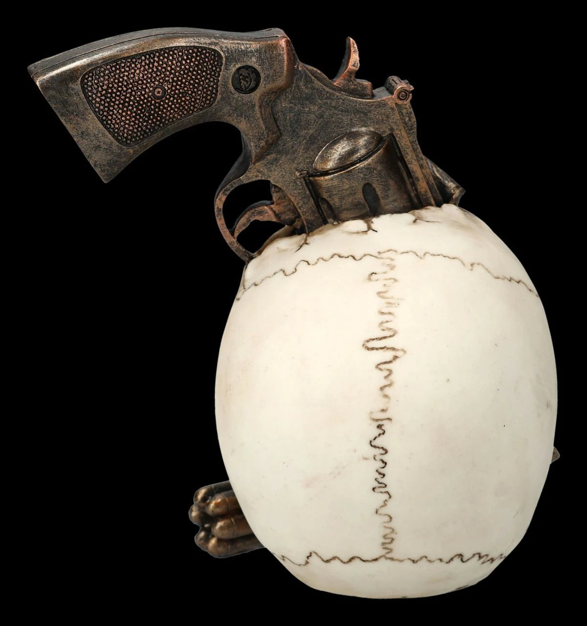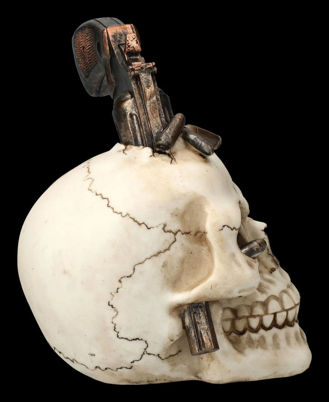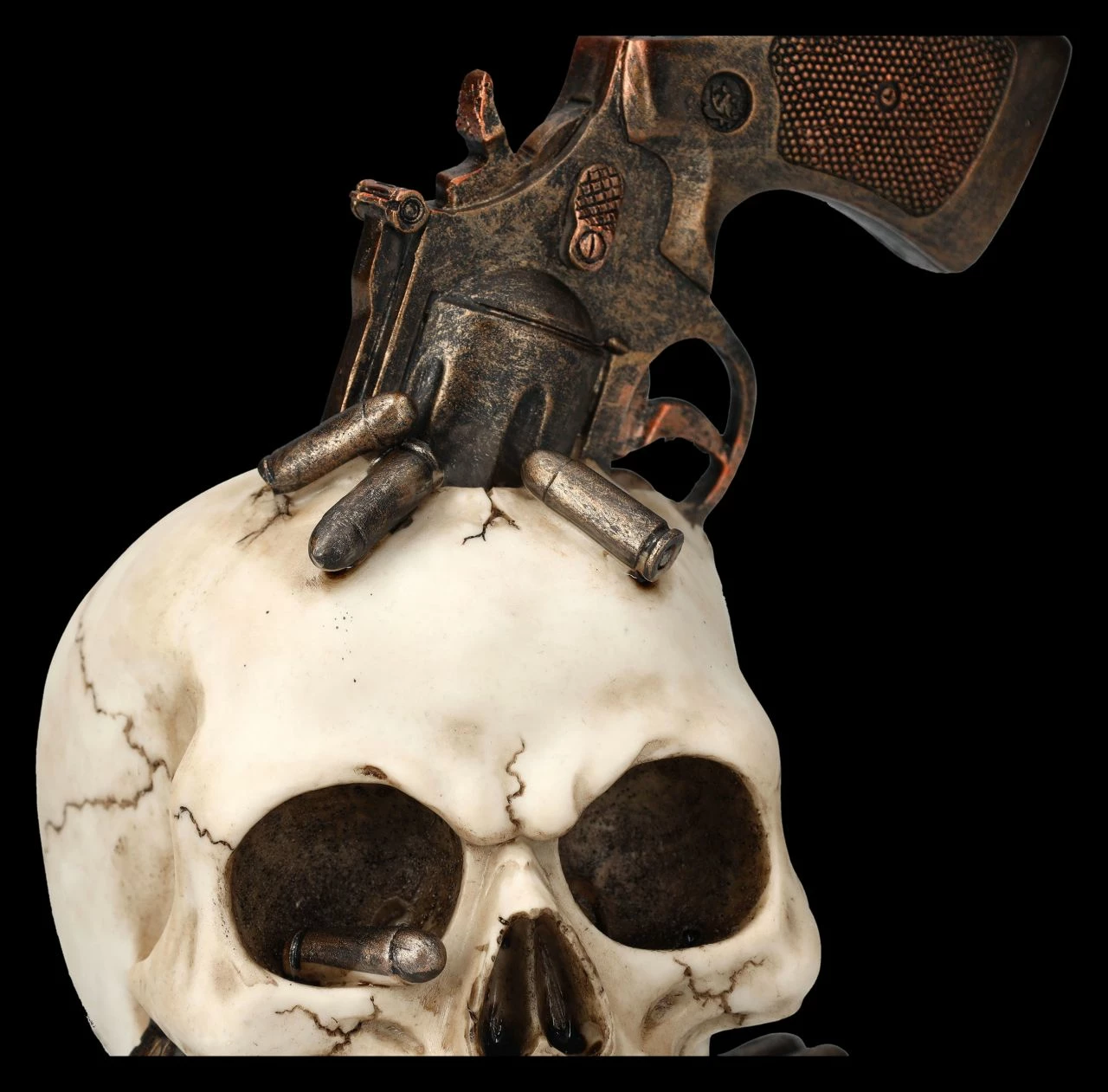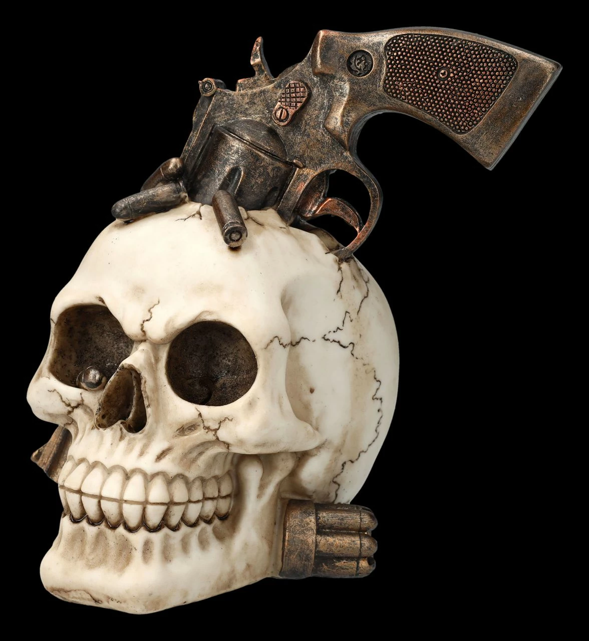 Hoppala – ist da der Revolver gleich mit allen Patronen im Schädel stecken geblieben? Allerdings grinst der Totenkopf mit dem Revolver im Schädel nicht gerade betrübt. Sorgsam aus handbemaltem Kunststein (Polyresin) gefertigt, ist der 17,5 cm hohe, 16 cm breite und 15 cm tiefe Totenkopf ein wahrer Hingucker. Er ist ein absolut witziges Accessoire auf jedem Schreibtisch oder Sideboard.und wird jeden Western-Fan begeistern.