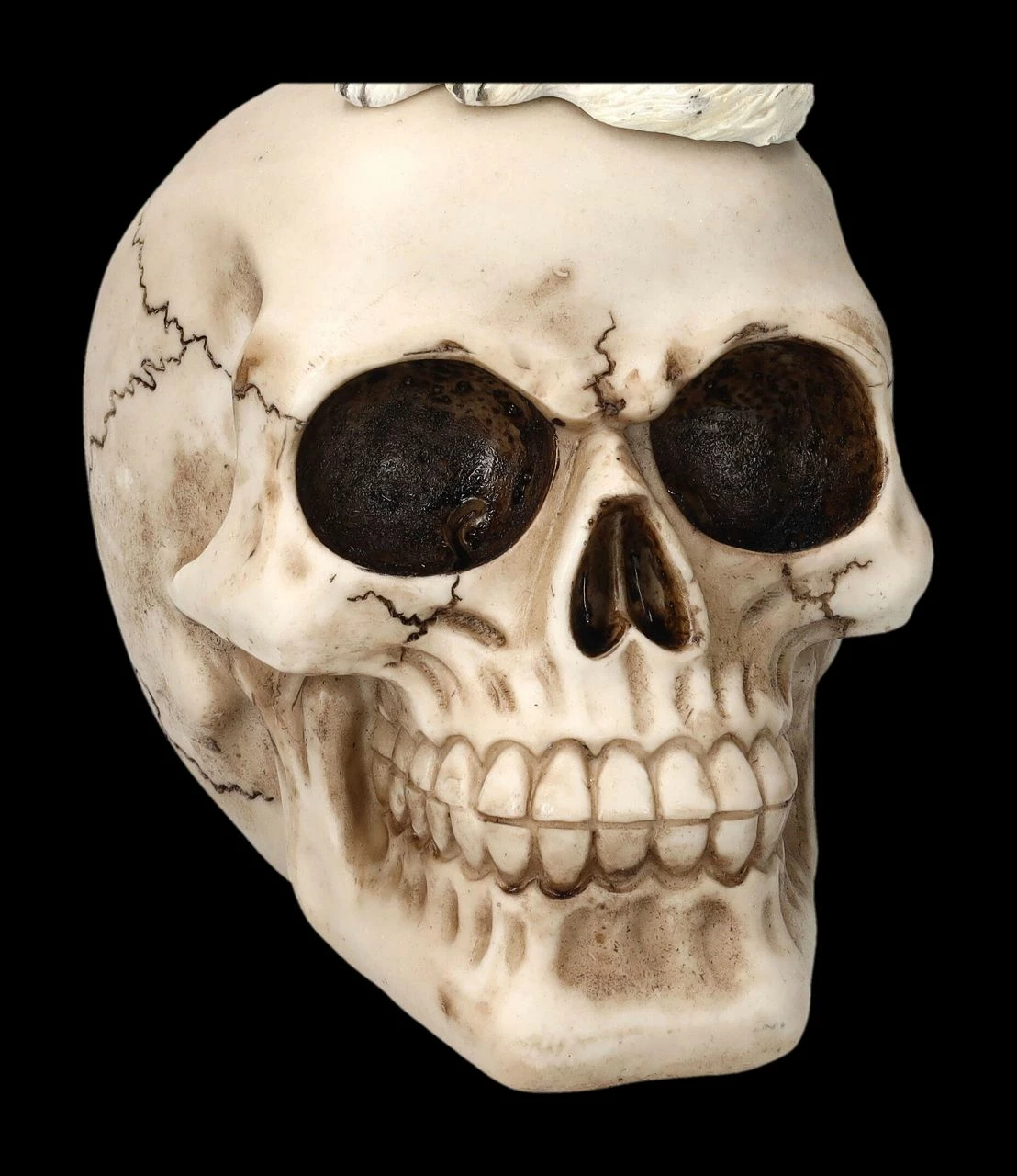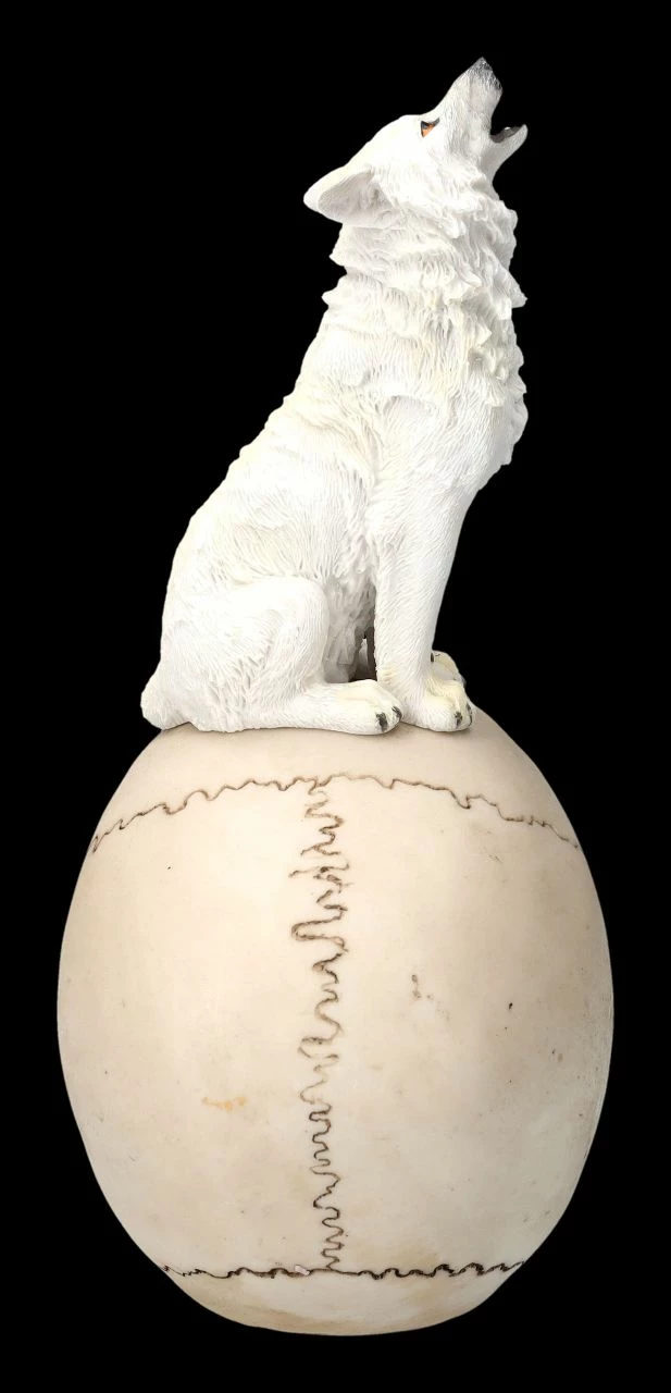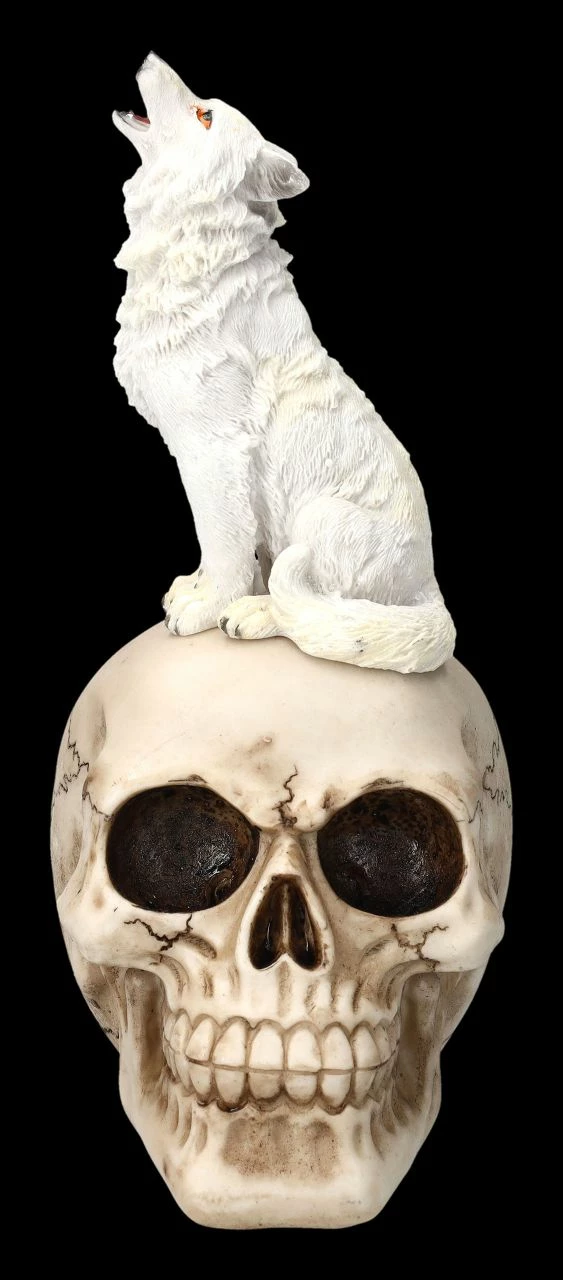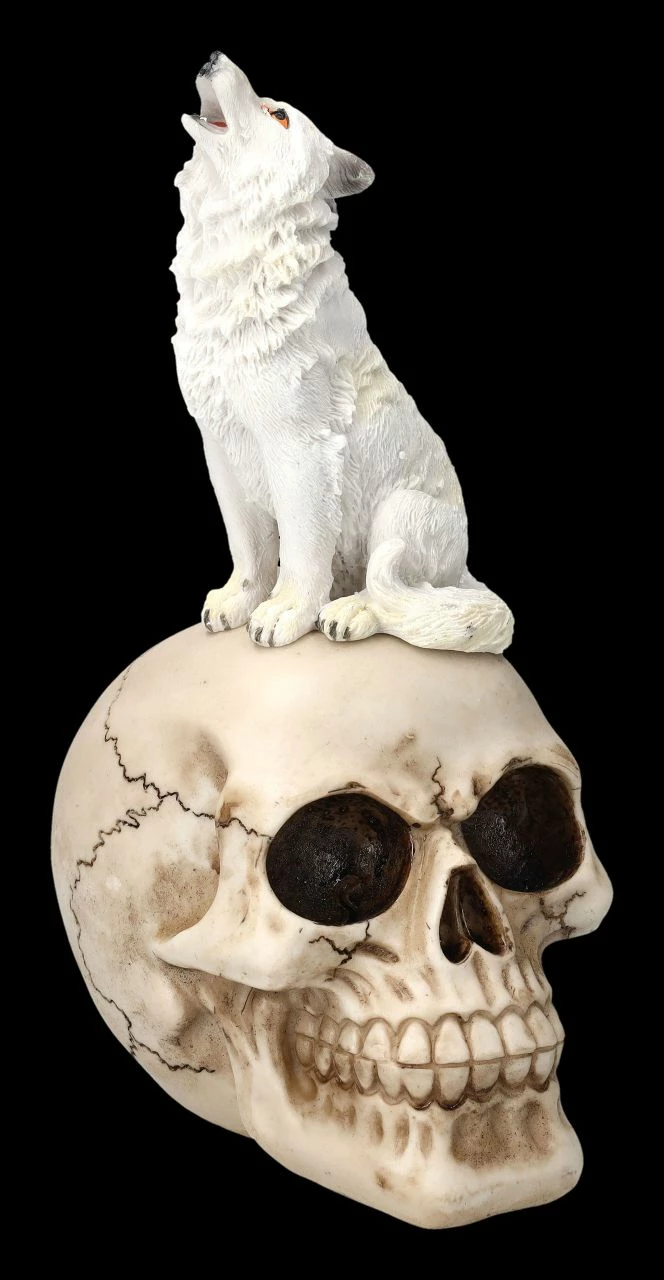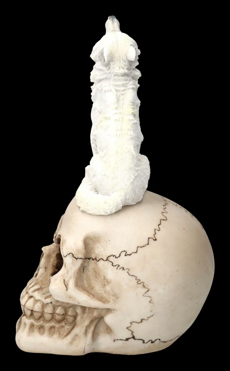 Die erhöhte Aussichtsplattform auf dem grinsenden Totenkopf nutzt ein weißer Wolf, um den Mond anzuheulen. Oder heult er um denjenigen, dem der Schädel einst gehörte? Nur die rötlichen Augen und die Zunge des Wolfes geben dieser fantasievollen Figur mit dem knochenfarbenen Schädel und dem weißen Wolf etwas Farbe. Der handbemalte Schädel mit dem heulenden Wolf wurde detailreich aus Kunststein (Polyresin) gefertigt. Mit der Höhe von 24 cm, der Breite von 11 cm und der Tiefe von 15 cm wird der weiße Wolf auf dem Schädel jeden Schädel-Sammler und Wolf-Freund begeistern, wenn er ihn als Geschenk bekommt.