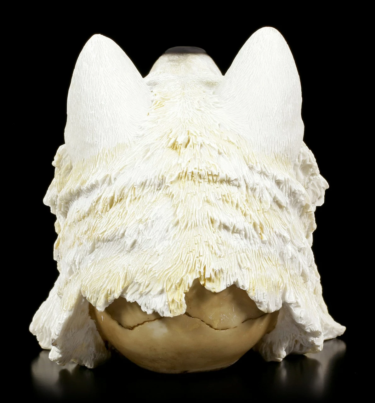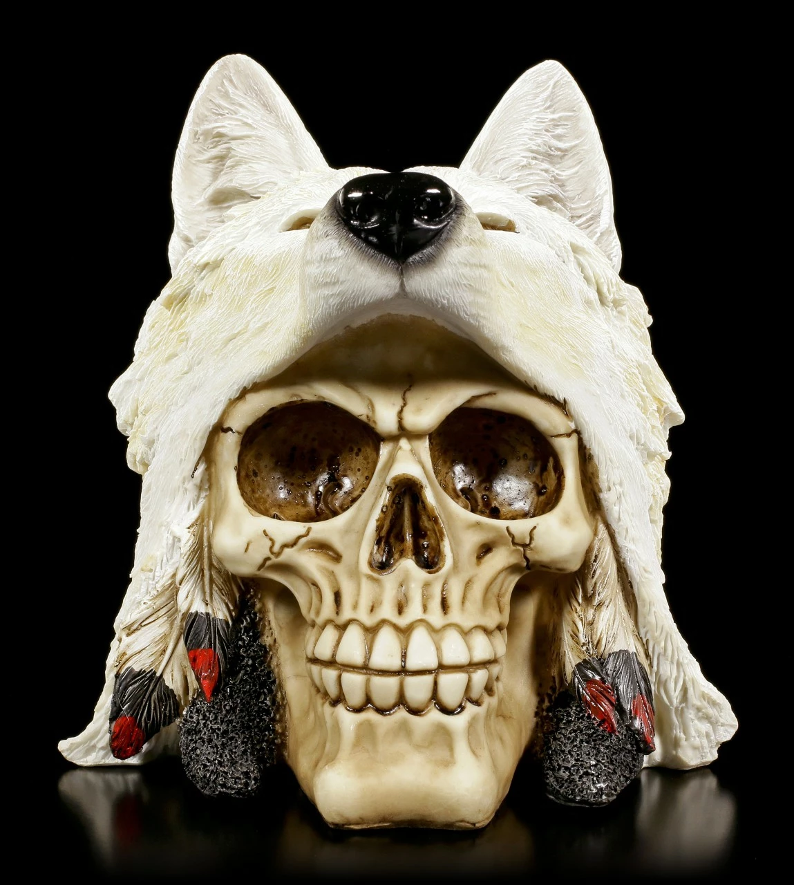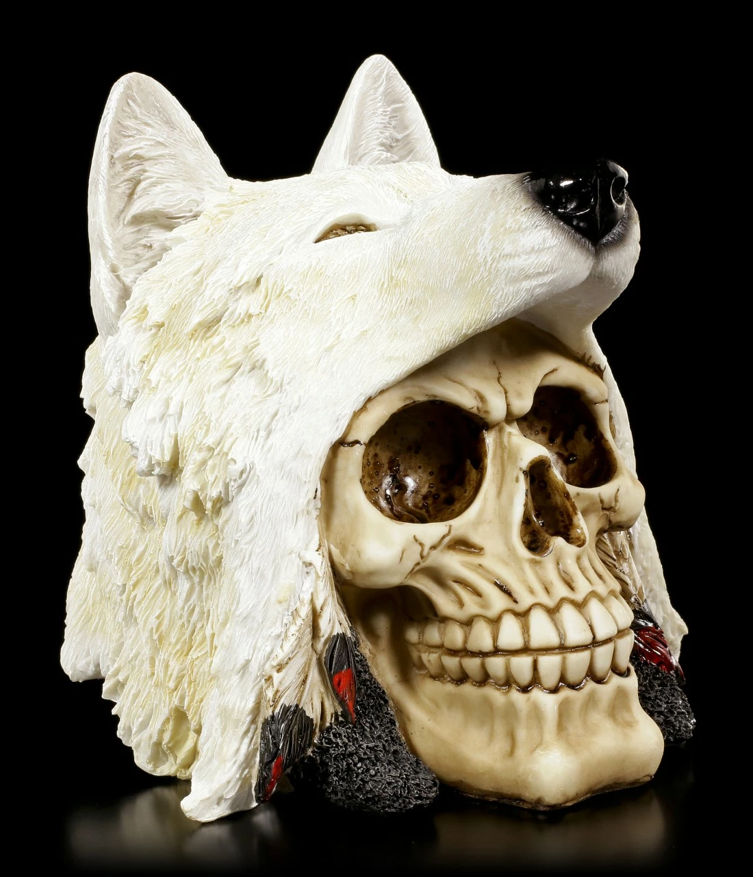 Grinsend trägt der Totenkopf das Fell eines prächtigen Wolfes als Mütze und wird so zu dem Highlight in einer Totenkopf Sammlung. Durch die besondere Machart wirkt der Wolf sehr realistisch.