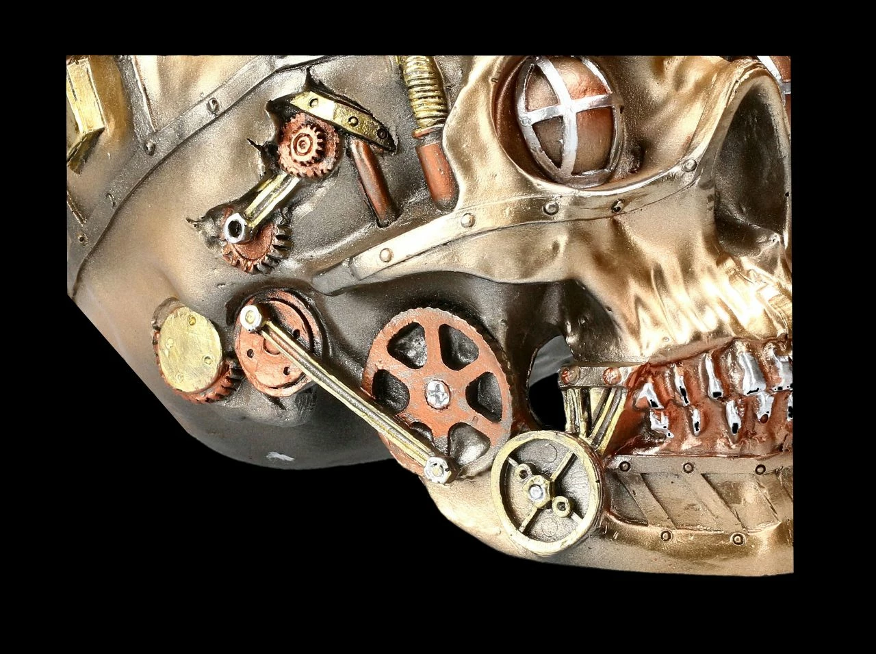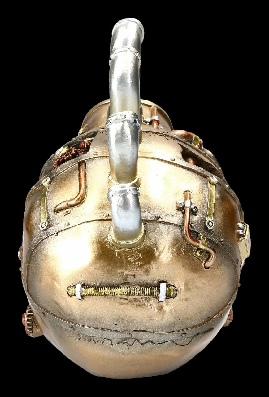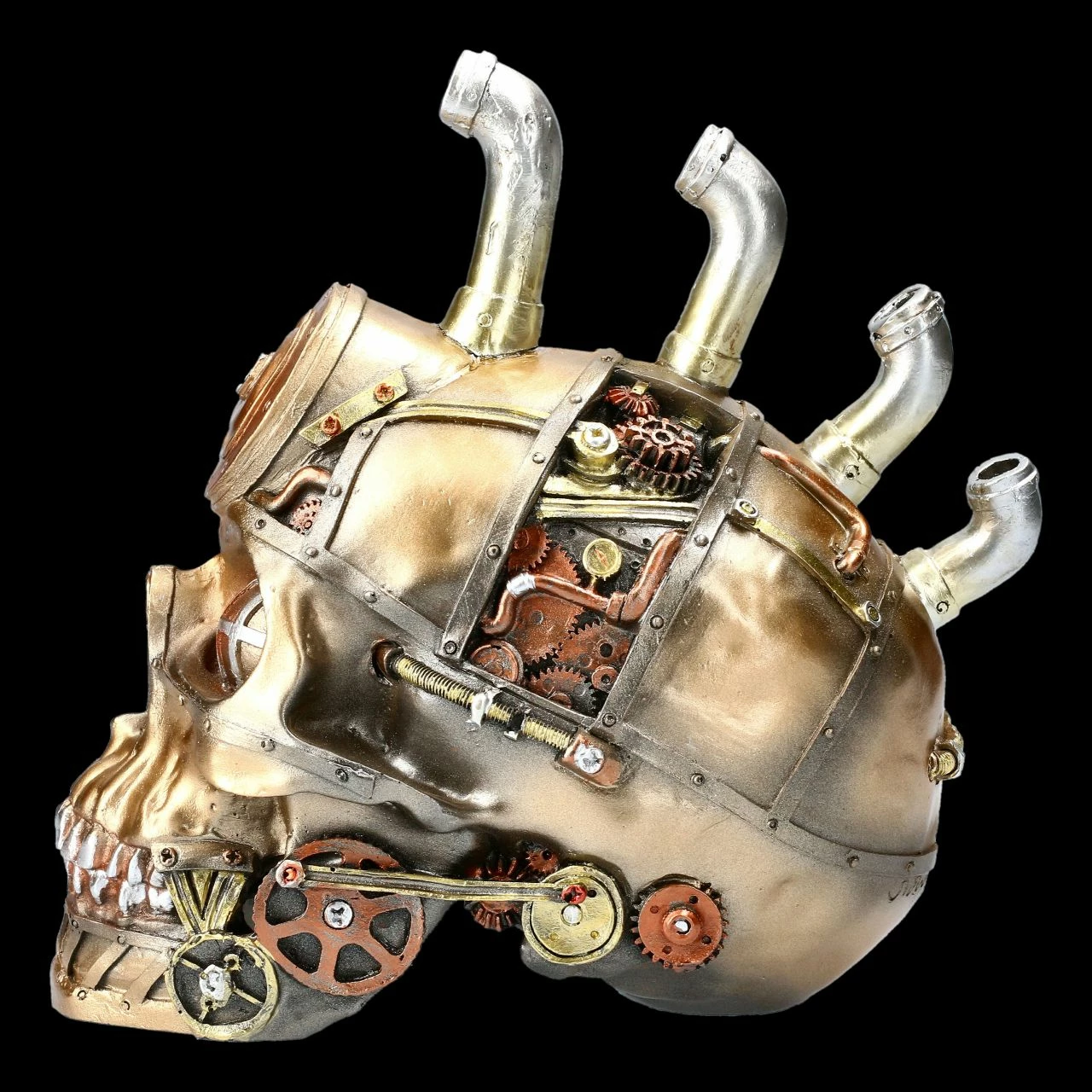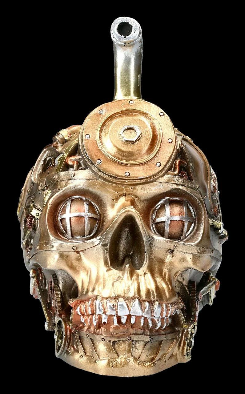 Er sieht aus, als wäre er aus den Tiefen des Ozeans aufgetaucht, wo er aus den Resten eines untergegangenen Schiffes zusammengebaut wurde. Mit so faszinierend vielen Details wurde dieser 19,5 cm hohe, 12 cm breite und 20 cm tiefe Totenkopf mit den Pipes aus Kunststein (Polyresin) gefertigt und die bronzefarbene Handbemalung lässt den Totenkopf Pipe Dream sehr technisch aussehen. Eine coole Deko, die mit Sicherheit Ihre Besucher erstaunen wird.