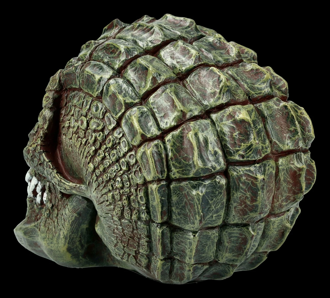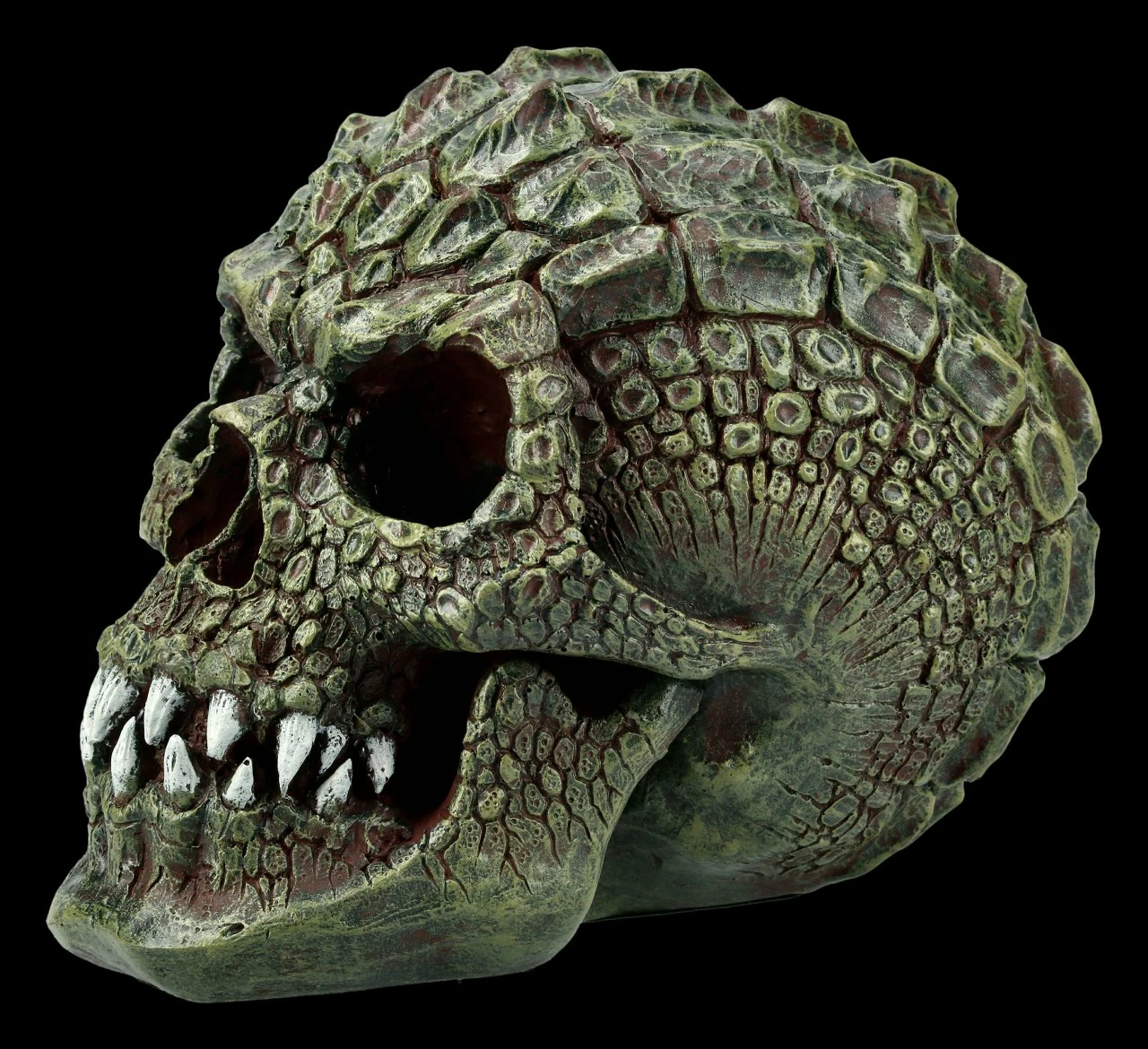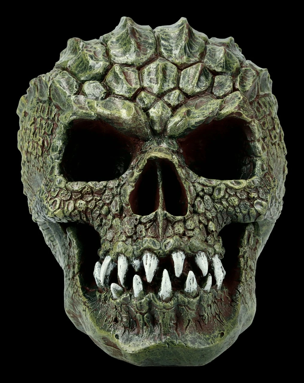 Einfach cool schaut dieser Totenkopf Reptil Gatorhead aus. Der in Grün mit roten Akzenten toll handbemalte Deko Totenkopf im Reptilien Look ist mit den Schuppen und mit den Drachen-Zähnen sehr detailreich aus Kunststein (Polyresin) gefertigt. Der außergewöhnliche Schädel hat eine Höhe von 13 cm, eine Breite von 12 cm und eine Tiefe von 17 cm. Auf Ihrem Schreibtisch oder im Regal wird er mit seinen vielen Details sicher alle Blicke auf sich ziehen.
