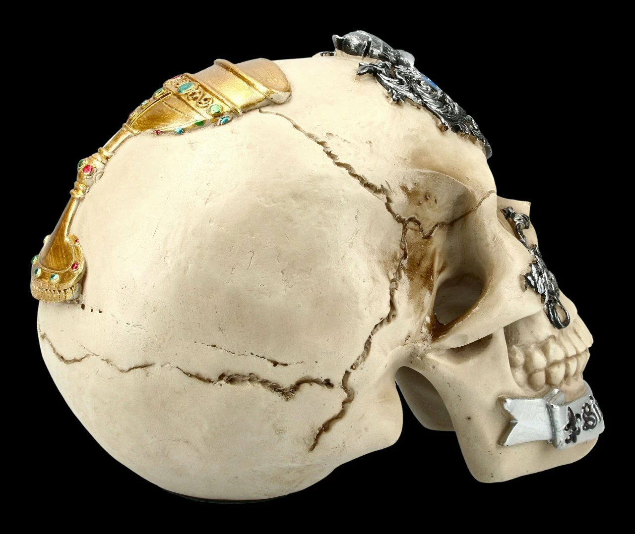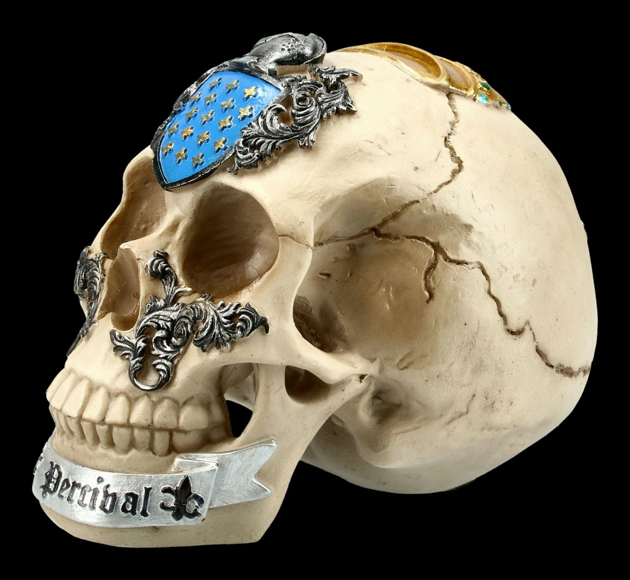 Sir Percival war der Legende nach der liebenswürdigste und keuscheste Ritter an König Arthurs Tafelrunde. Wie Sir Galahad und Sir Bors machte er sich auf die Suche nach dem Heiligen Gral. Das Wappen auf der Stirn dieses ausgefallenen Totenschädels zeigt goldene Sterne auf blauem Grund. Auf dem silberfarbenen Schriftband am Kinn steht der Name von ‚Sir Percival‘ Der Deko Totenschädel von Sir Percival ist mit silberfarbenen Ornamenten verziert und auf der Schädelbasis ist der Goldene Gral angebracht. Der ungewöhnliche Totenkopf hat eine Höhe von 13,5 cm, eine Breite von 12 cm und eine Tiefe von 16,5 cm. Er ist sehr detailreich aus Kunststein (Polyresin) gefertigt und sorgfältig von Hand bemalt.