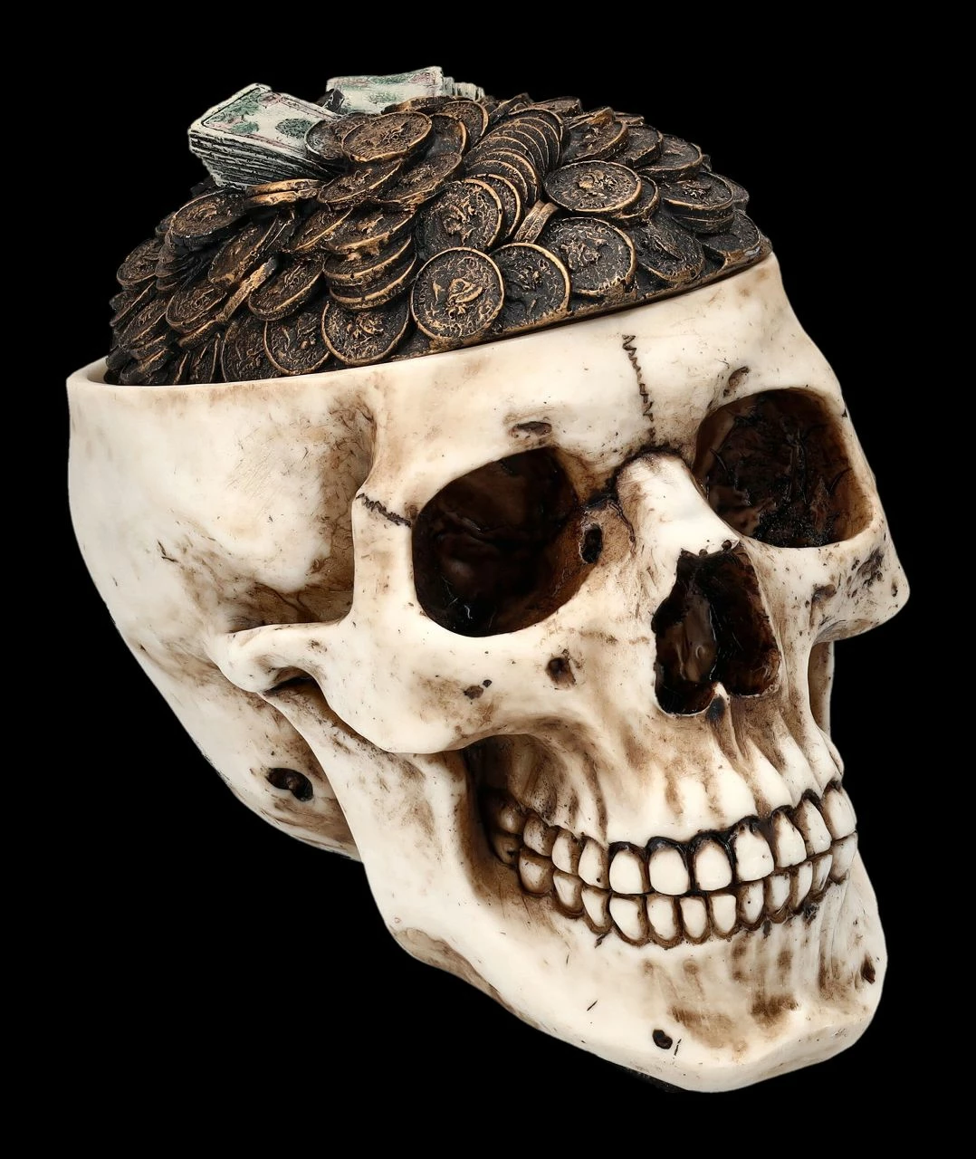 Hoffentlich kommt niemand in Versuchung, die Schädeldecke dieses Totenkopfes abzuheben, denn dann entdeckt er die geheimnisvolle Schatulle darunter, in der man perfekt Münzen oder andere kleine Kostbarkeiten aufheben kann. Aus der Schädeldeckel des Totenkopfes scheint ein Haufen Geld in Form von Scheine und Münzen hervorzuquellen. Die zahlreichen Details der knochenfarben handbemalten Schädelschatulle aus Kunststein (Polyresin) sind einfach faszinierend. Der 13 cm hohe, 11 cm breite und 16 cm tiefe Schädel hat innen eine Öffnung mit den Maßen H 7 cm x B 6 cm x T 10 cm für besondere kleine Kostbarkeiten.