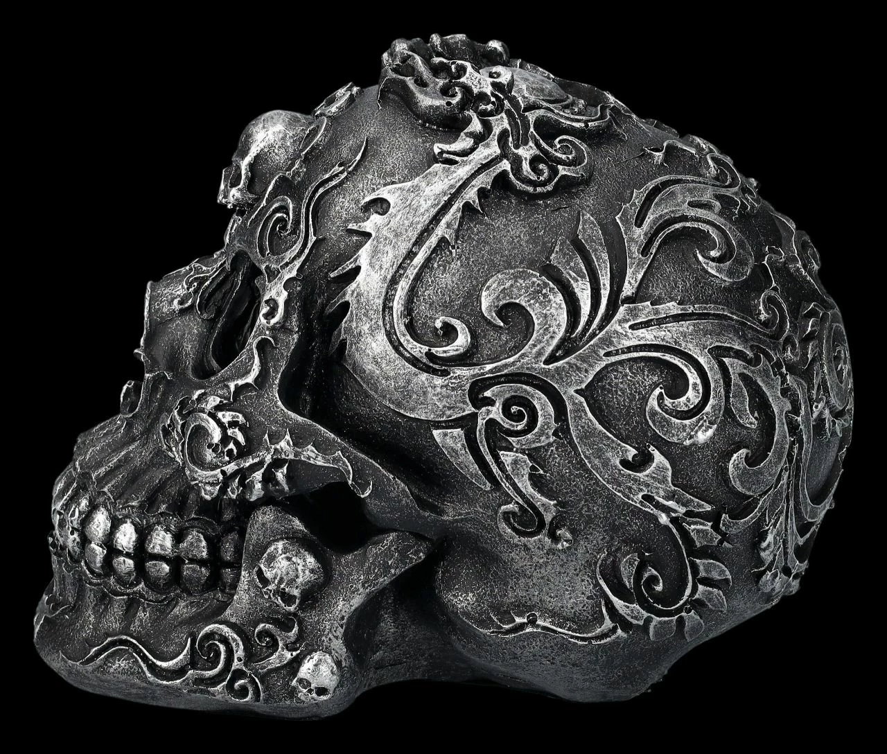 Die fantastischen Verzierungen dieses schwarzen Totenkopfes wirken beinahe wie aus Metall. Auf der Schädelbasis des Gothic Skull ist eine mit einem Strahlenkranz umgebene runde Platte, die wie eine Sonne das Zentrum des Musters bildet. Der 13 cm hohe, 11,5 cm breite und 17 cm tiefe Totenschädel wurde sehr detailreich aus handbemaltem Kunststein (Polyresin) gefertigt. Er ist eine tolle Ergänzung für jede Sammlung.