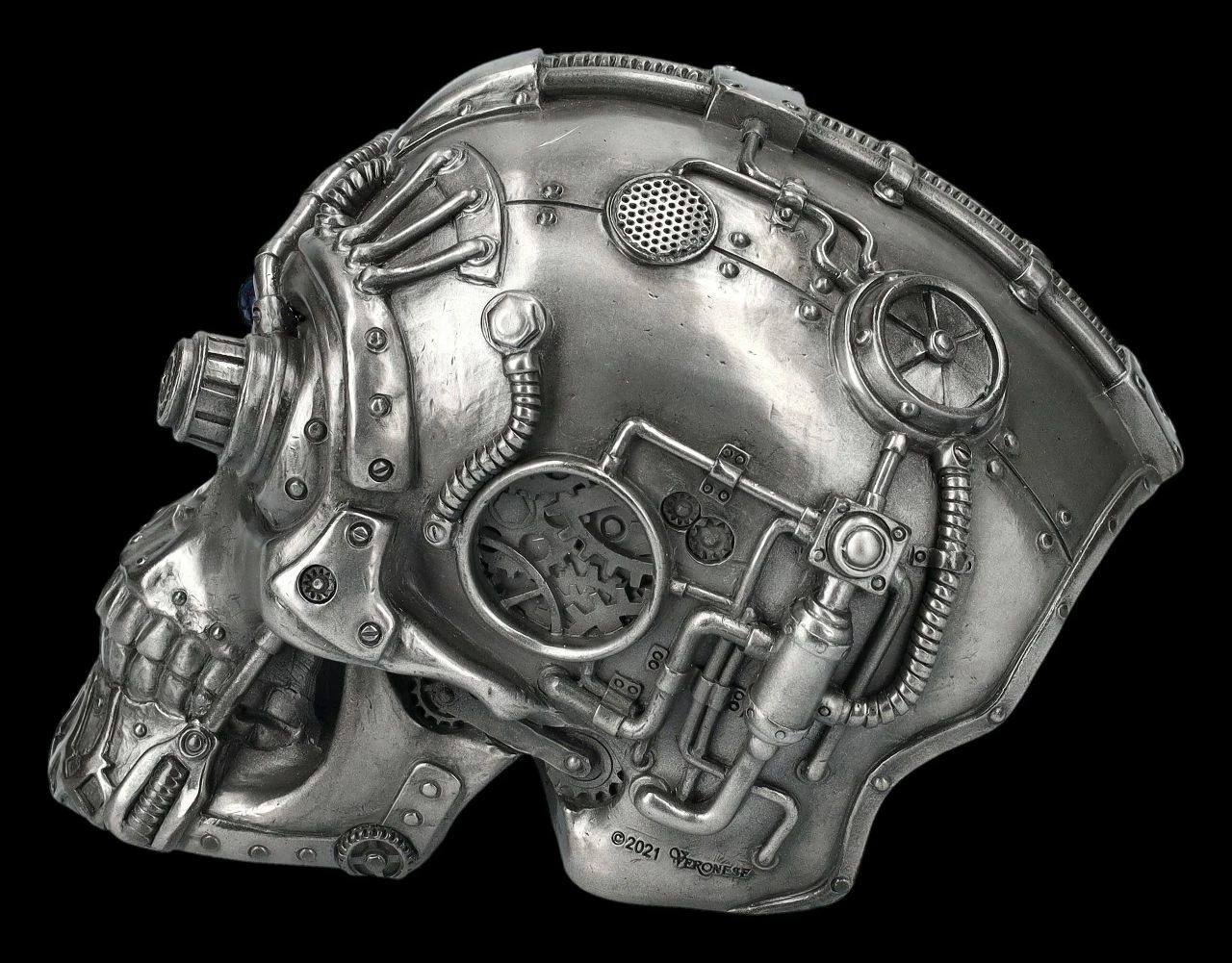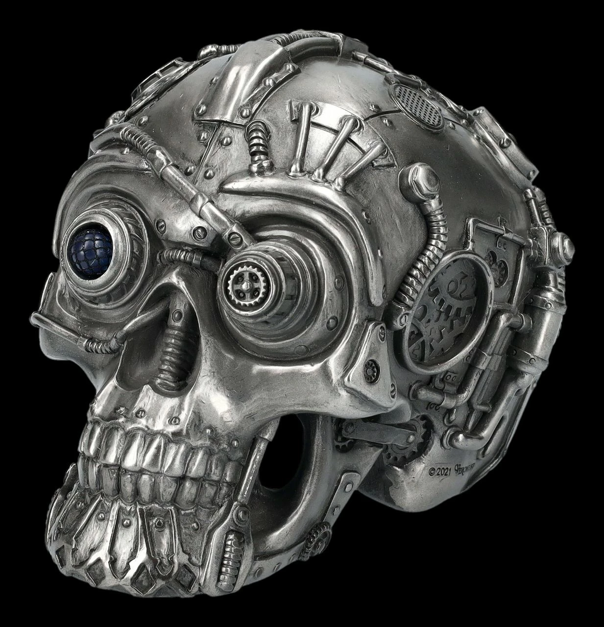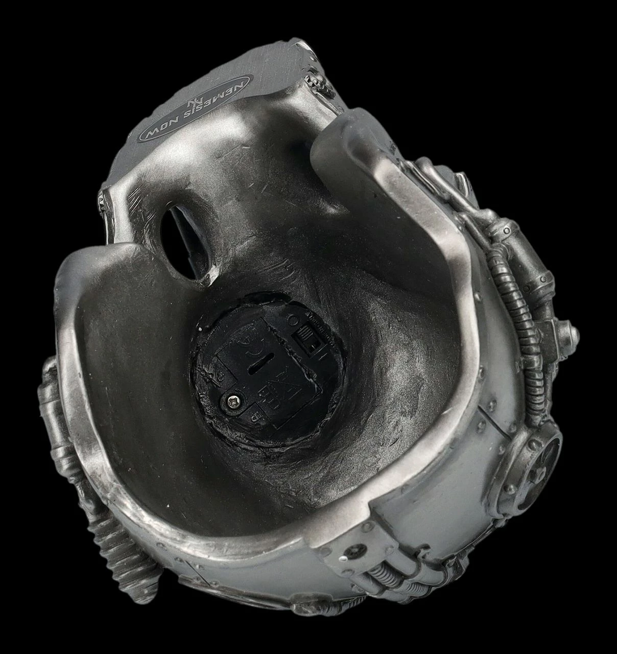 Wow – aus welcher Galaxie stammt dieser außergewöhnliche Totenkopf? Durch die batteriebetriebene LED-Beleuchtung leuchtet ein Auge des Cybertron magisch blau. Der 12 cm hohe, 11,5 cm breite und 16 cm tiefe Totenkopf im fantasievoll technisch wirkenden Steampunk-Stil stammt aus der Studio Collection von Veronese. Er ist mit den zahlreichen Details fantastisch aus hochwertigem Kunststein (Polyresin) gegossen und sorgfältig von Hand bemalt. Für die LED-Beleuchtung werden 3 x LR44 Batterien benötigt. Sie sind nicht in der Lieferung enthalten. Dieser Cybertron Totenkopf mit der LED Beleuchtung ist ein fantastischer Blickfang und das perfekte Geschenk für Steampunk-Fans.