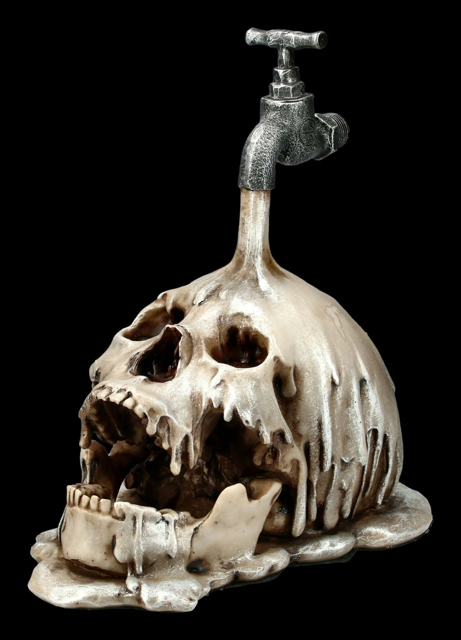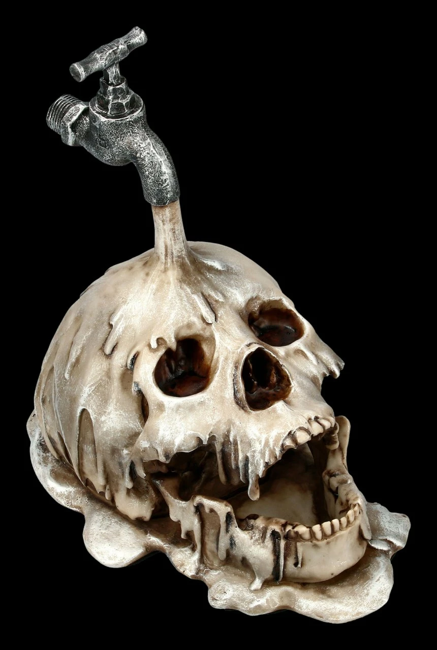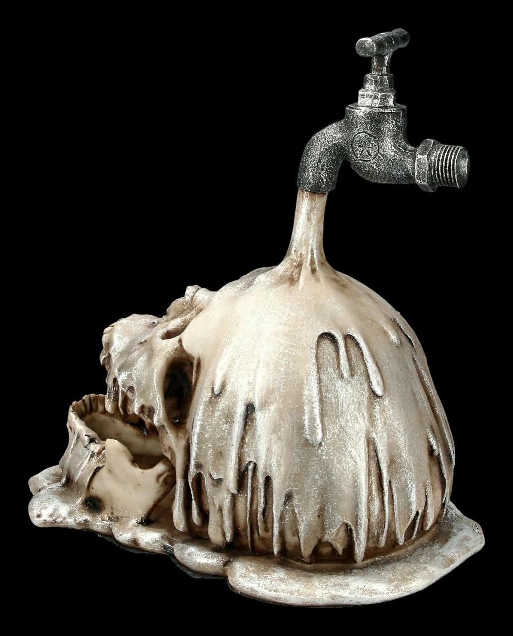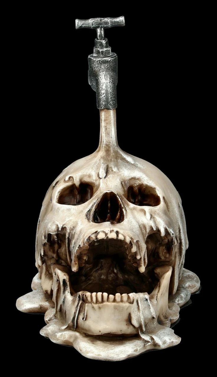 O’zapft is? Wenn aus dem altertümlichen Wasserhahn das Bier herausschäumt und sich aus dem Schaum dann dieser skurille Totenkopf mit dem entsetzten Gesichtsausdruck abbildet, sollte man sich vielleicht fragen, ob man nicht schon genug gezapft hat. Der außerordentlich witzige Totenkopf direkt aus dem Fass ist aus handbemaltem Kunststein (Polyresin) gefertigt. Der Totenkopf Tapped ist 15 cm hoch, 15 cm breit und 23,5 cm tief. Die Gesamthöhe mit dem „Bierhahn“ ist 24 cm. Eine wirklich lustige Deko, die mit Sicherheit alle Blicke auf sich ziehen wird.