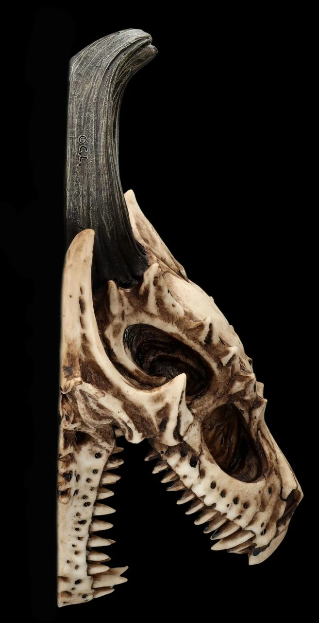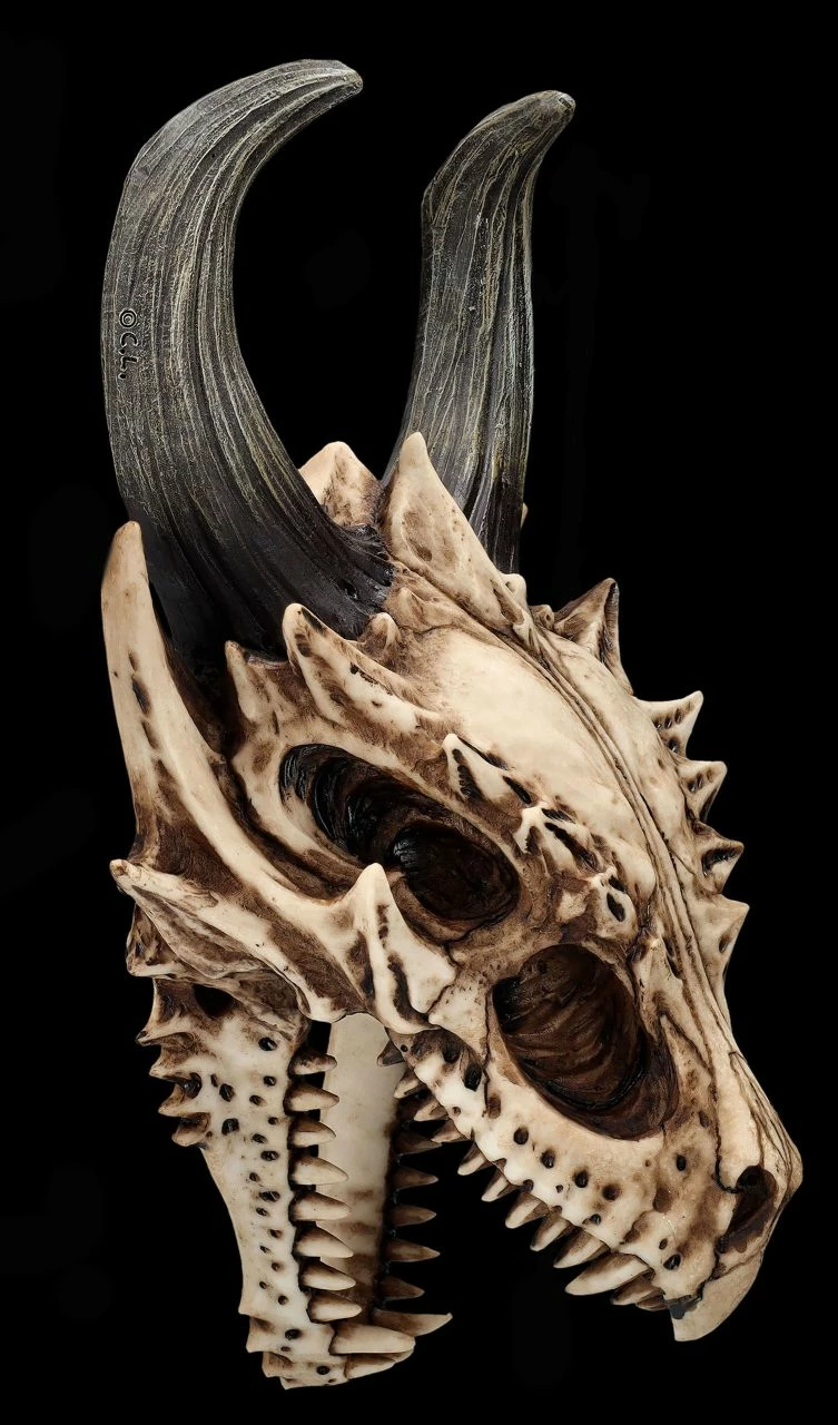 Mitten im Angriffsmodus scheint der letzte gehörnte Drache sein Ende gefunden zu haben. Wer den angriffslustigen Schädel des mystischen Drachens nun an Ihrer Wand entdeckt, wird einen leichten Schauer nicht vermeiden können. Die dunklen Hörner des detailreich aus Kunststein (Polyresin) gefertigten und knochenfarben handbemalten Schädels wirken mystisch und dramatisch. Der 29,5 cm hohe, 17,5 cm breite und 13 cm tiefe fiese Schädel des letzten Drachens kann an die Wand gehängt werden und hat dafür eine Aufhängung an der Rückseite des Schädels. Im Eingangsbereich aufgehängt, wird der teuflische Drachenkopf Ihre Besucher gebührend empfangen…