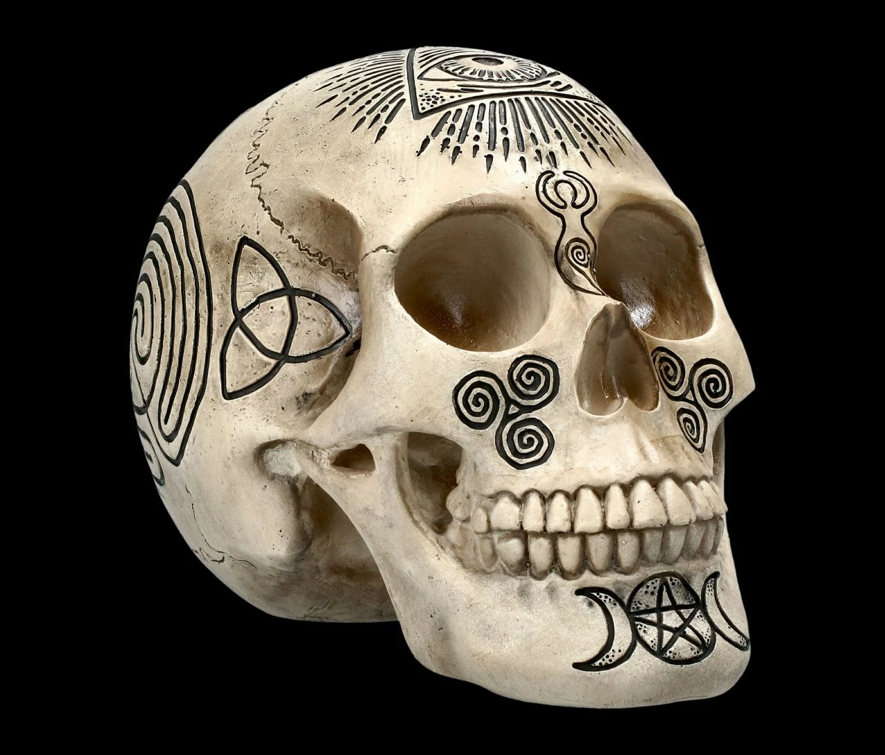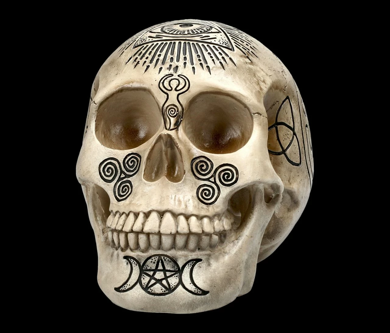 Für Hexen und Magier ist dieser handbemalte Totenschädel ein unverzichtbares Zubehör für ihre Rituale. Der coole Totenschädel mit den Zeichen der Spiralgötttin und dem Wiccazeichen mit dem Pentagramm in der Mitte ist sorgsam aus handbemaltem Kunststein (Polyresin) gefertigt. Er ist 12,5 cm hoch, 12 cm breit und 16,5 cm tief. Der Totenschädel Witchcraft ist ein magischer und effektvoller Blickpunkt.