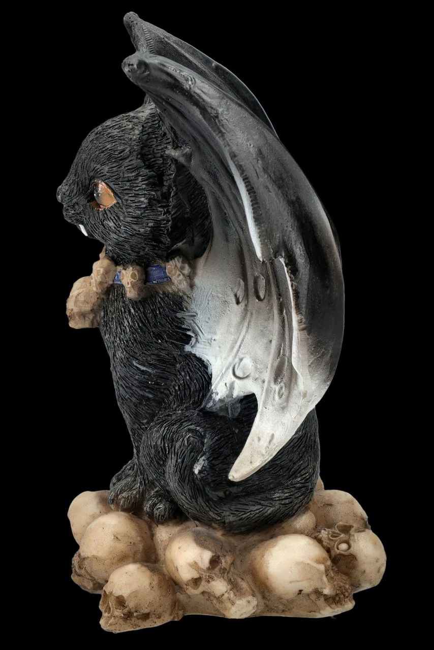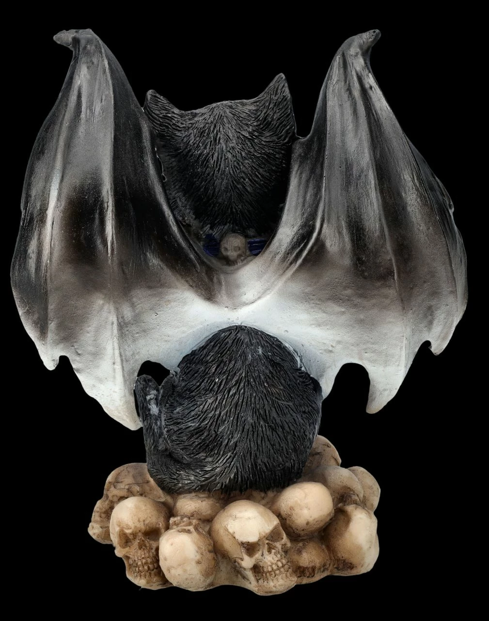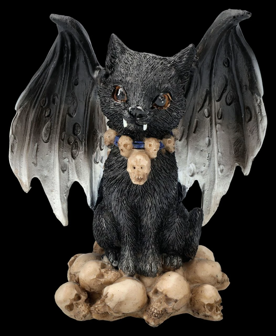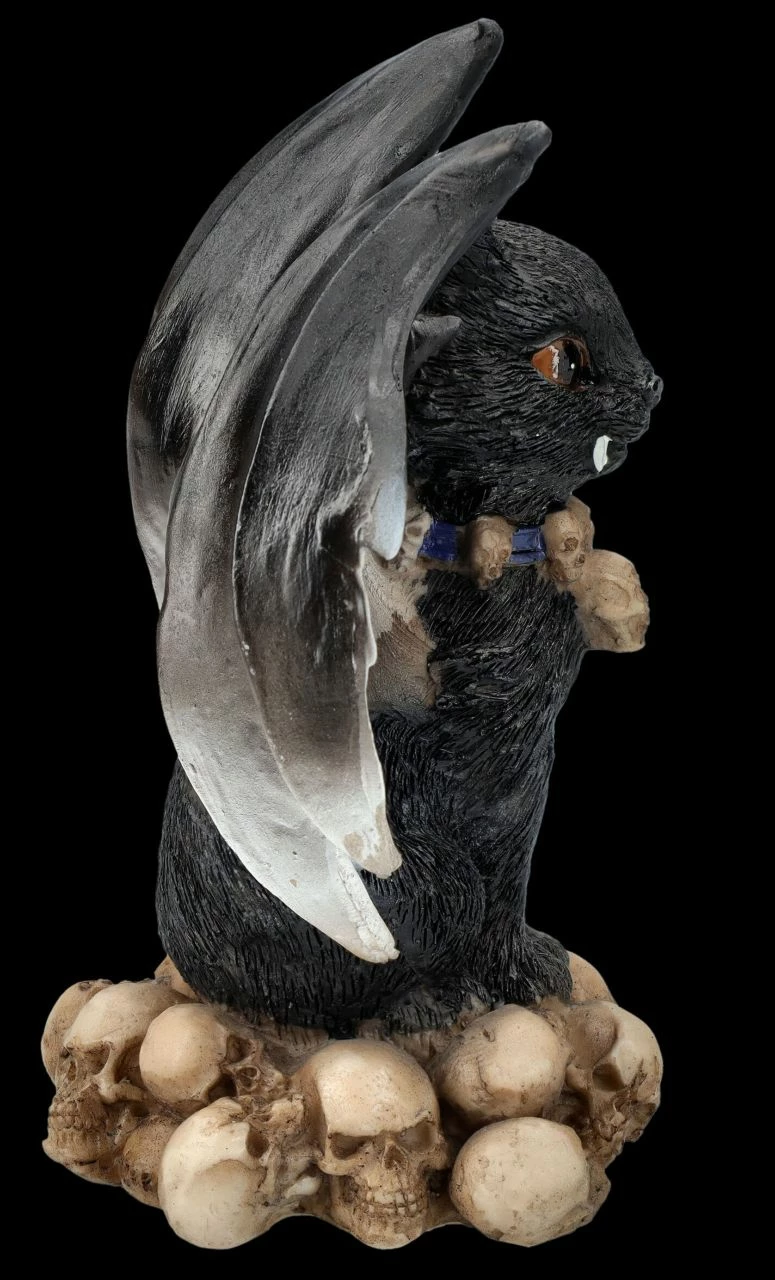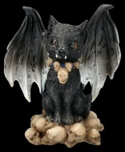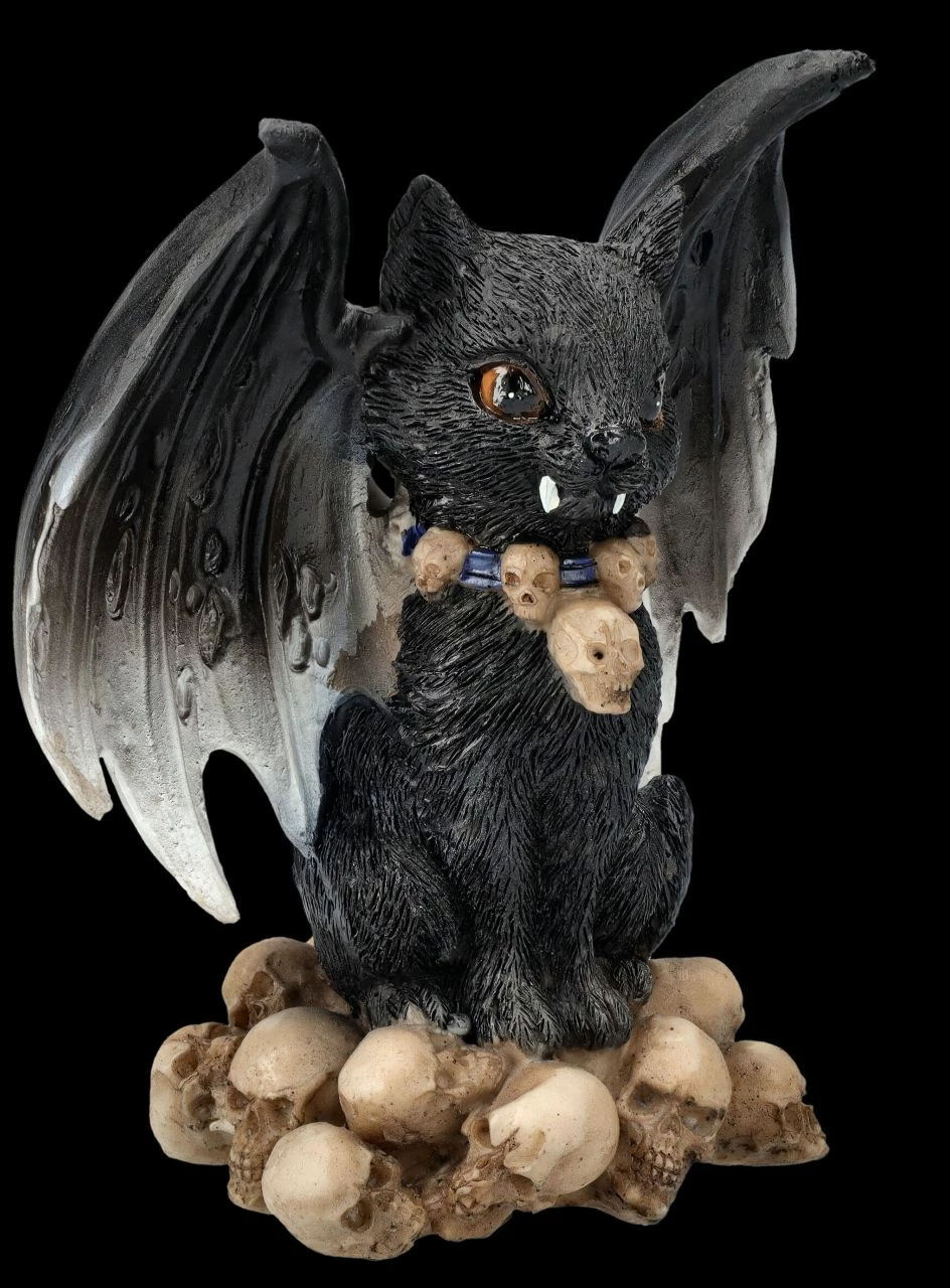 Vermutlich gibt es den einen oder anderen, der seiner Katze zutraut, in Wirklichkeit eine kleine Vampirkatze zu sein. Bei Graf Catula, der Vampir-Katze mit den großen Fledermausflügeln, die hier auf einem Kreis aus Schädeln sitzt, ist das wohl unmissverständlich. Da kann die 14,5 cm hohe, 12,5 cm breite und 8 cm tiefe Vampir-Katze noch so unschuldig schauen. Graf Catula ist detailreich aus handbemaltem Kunststein (Polyresin) gefertigt und nicht nur an Halloween eine perfekte Deko.