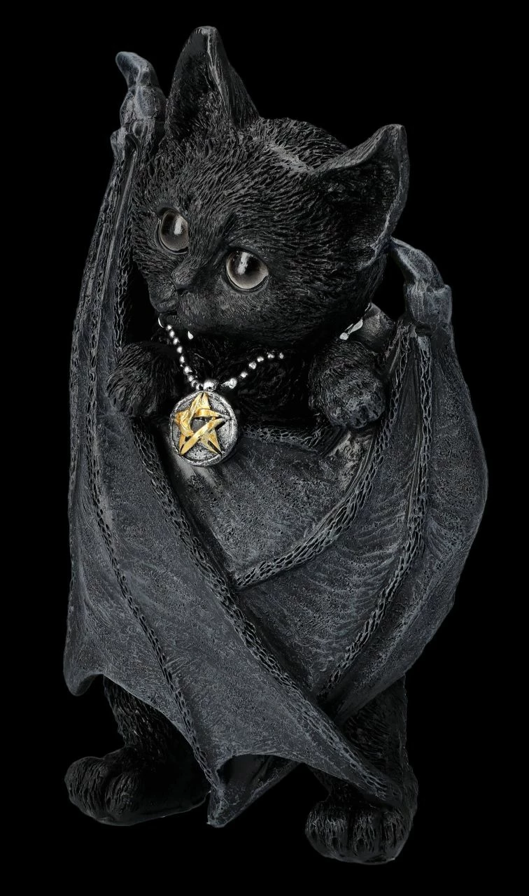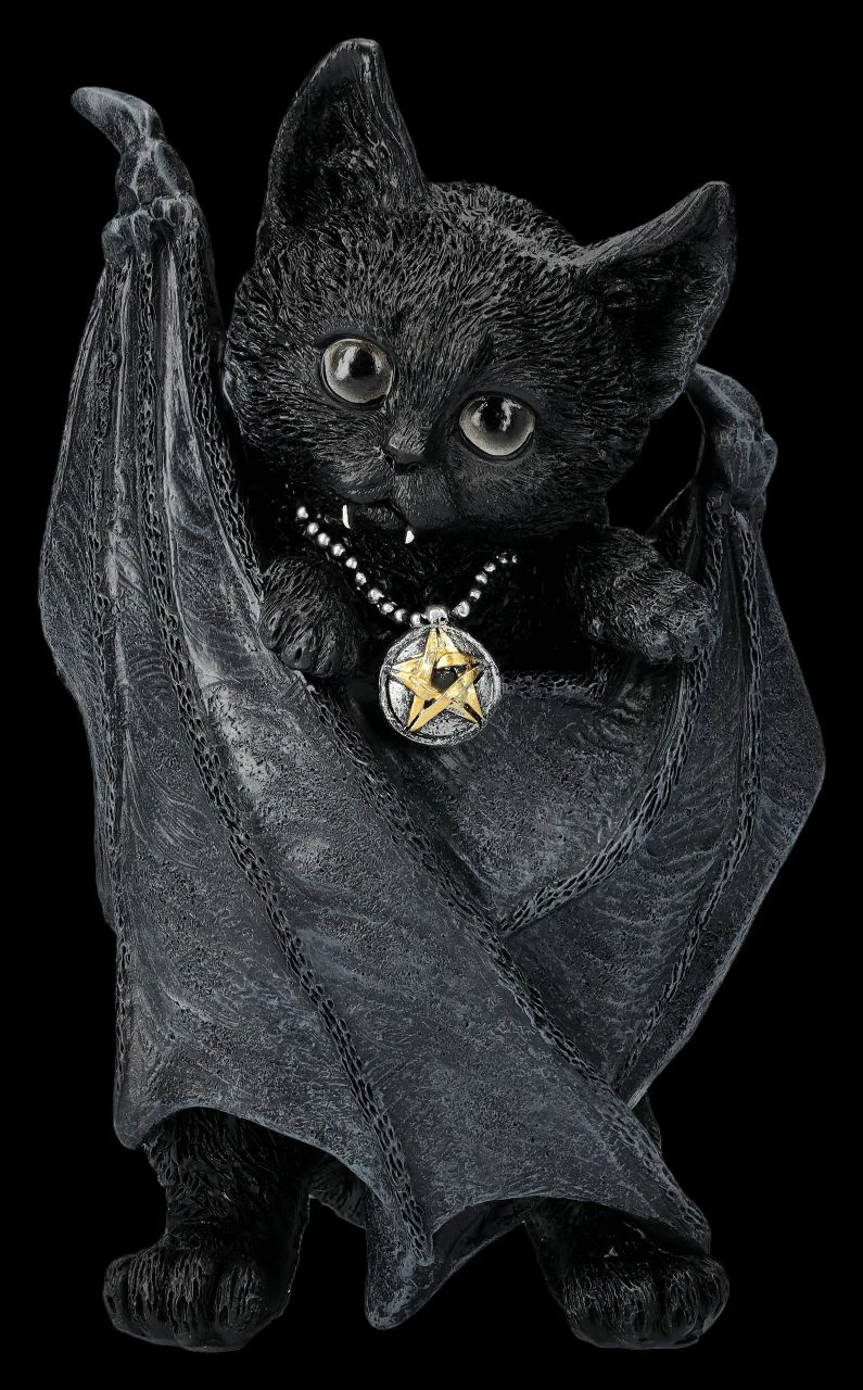 Wenn Katzen nicht nur die Krallen ausfahren, sondern auch die Vampirzähne hervorblitzen, wird es unter Umständen gefährlich. Aber der unschuldige Blick der schwarzen Vampir-Katze und die schöne Halskette mit dem goldenen Pentagramm-Anhänger sollen vermutlich beruhigen. Dazu faltet sie auch noch ganz brav ihre Fledermausflügel um sich herum. Die niedliche Vampir-Katze Count Catula mit der Halskette ist aus liebevoll handbemaltem Kunststein (Polyresin). Sie ist 16,5 cm hoch, 10 cm breit und 8 cm tief und eine tolle Deko zu Halloween oder wann auch immer…
