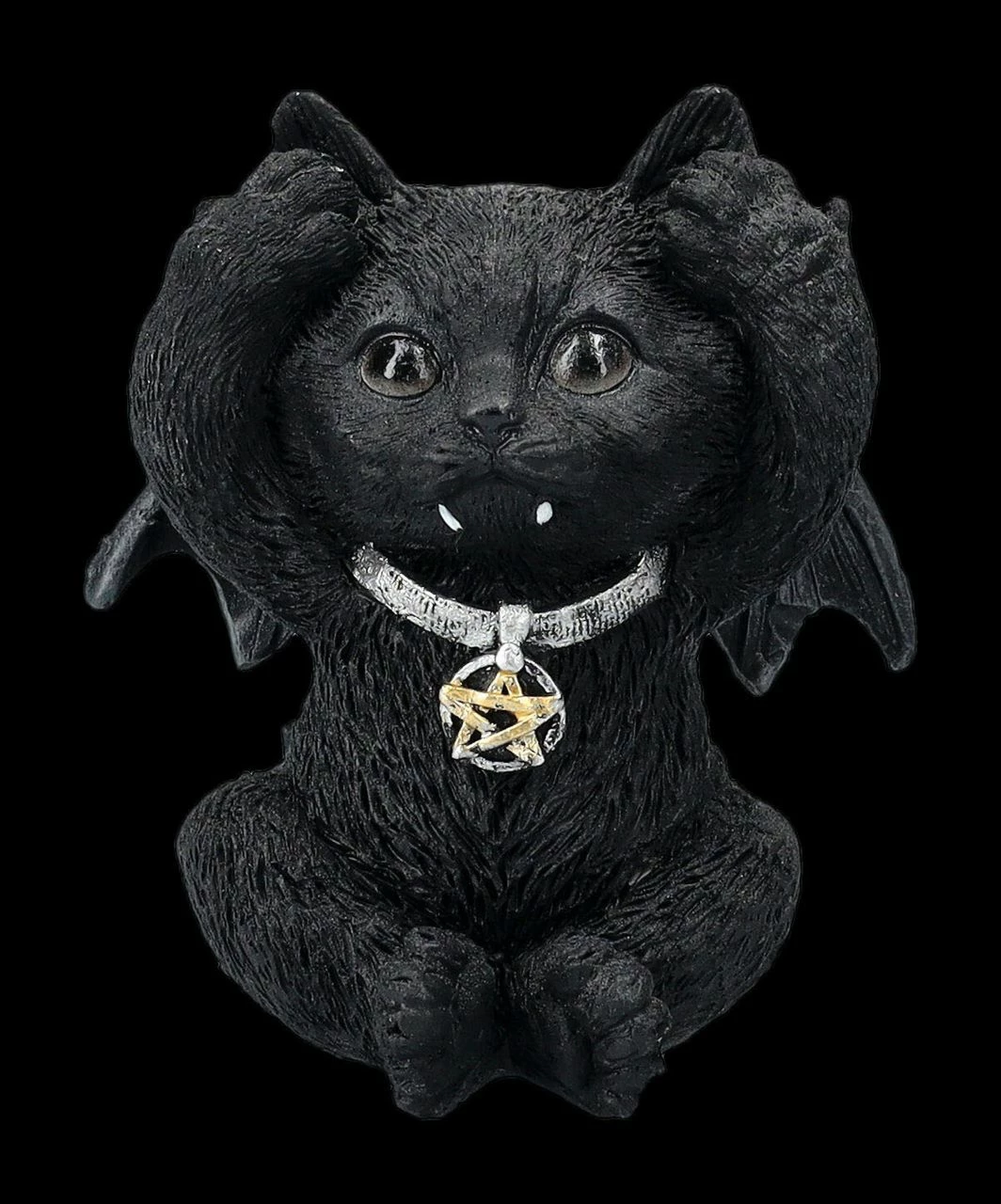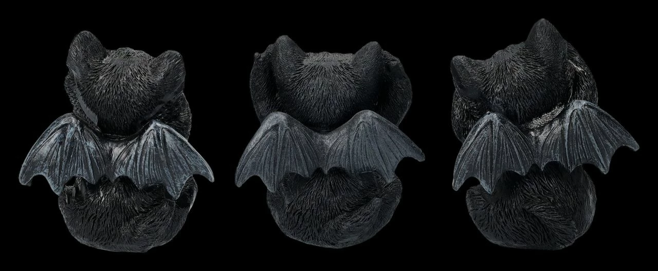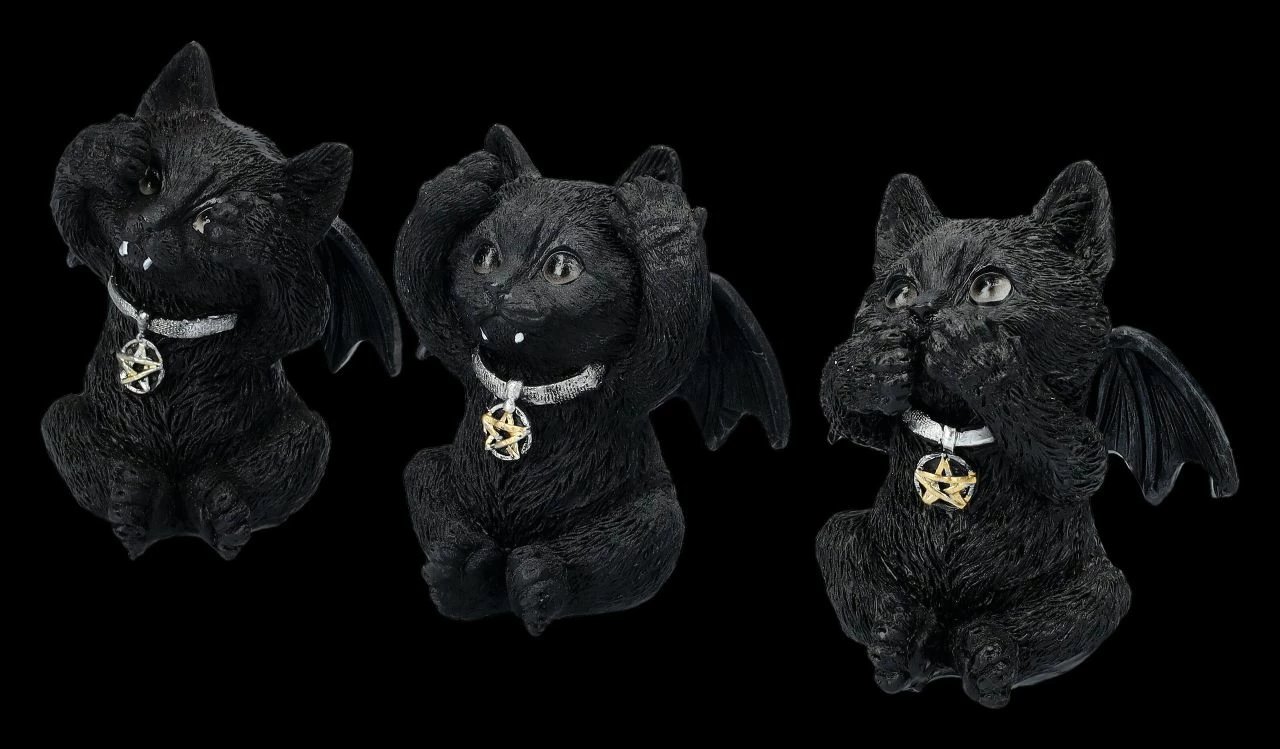 Nun ja – ob das jetzt glaubwürdig ist, sollte jeder für sich entscheiden. Auf jeden Fall sind die drei Vampirkatzen, die demonstrativ zeigen, dass sie nichts Böses hören, sehen und schon gar nicht sagen möchten, sehr witzig anzusehen. Die ca. 8 – 9 cm hohen, je 7 cm breiten und 5 -6 cm tiefen Vampirkatzen aus handbemaltem Kunststein (Polyresin) sind sicher das Highlight auf jedem Schreibtisch und damit auch ein vielsagendes Geschenk.