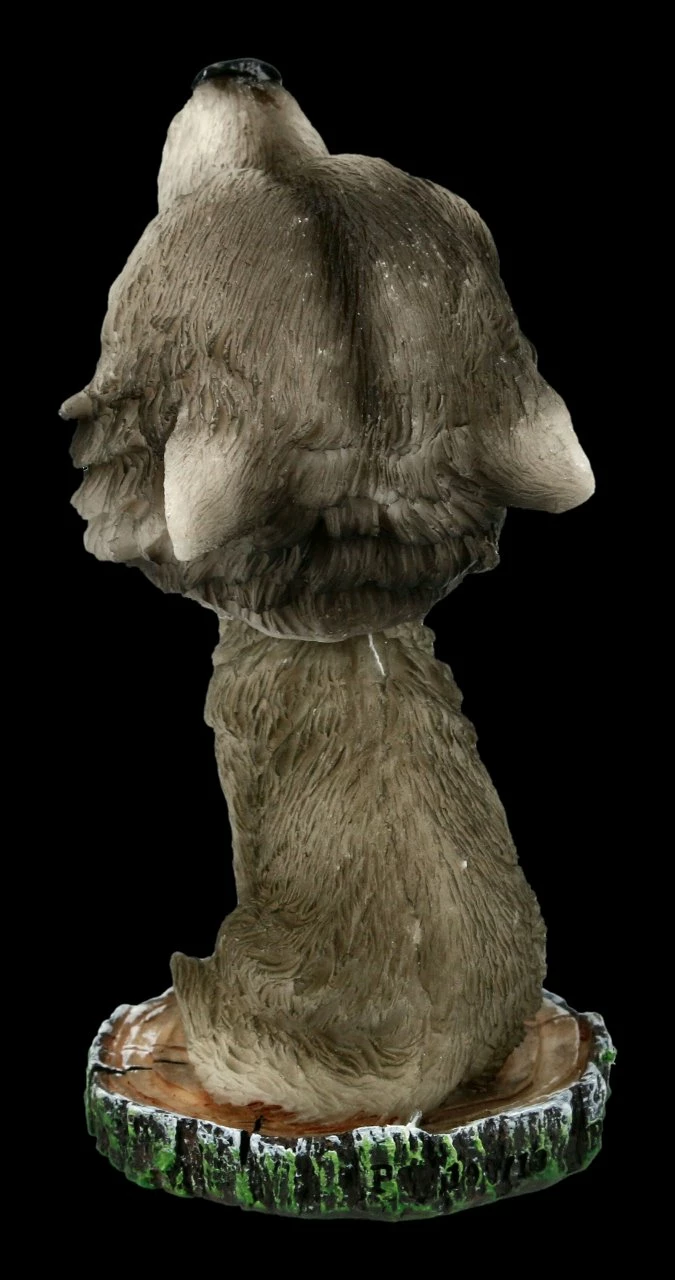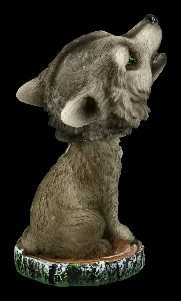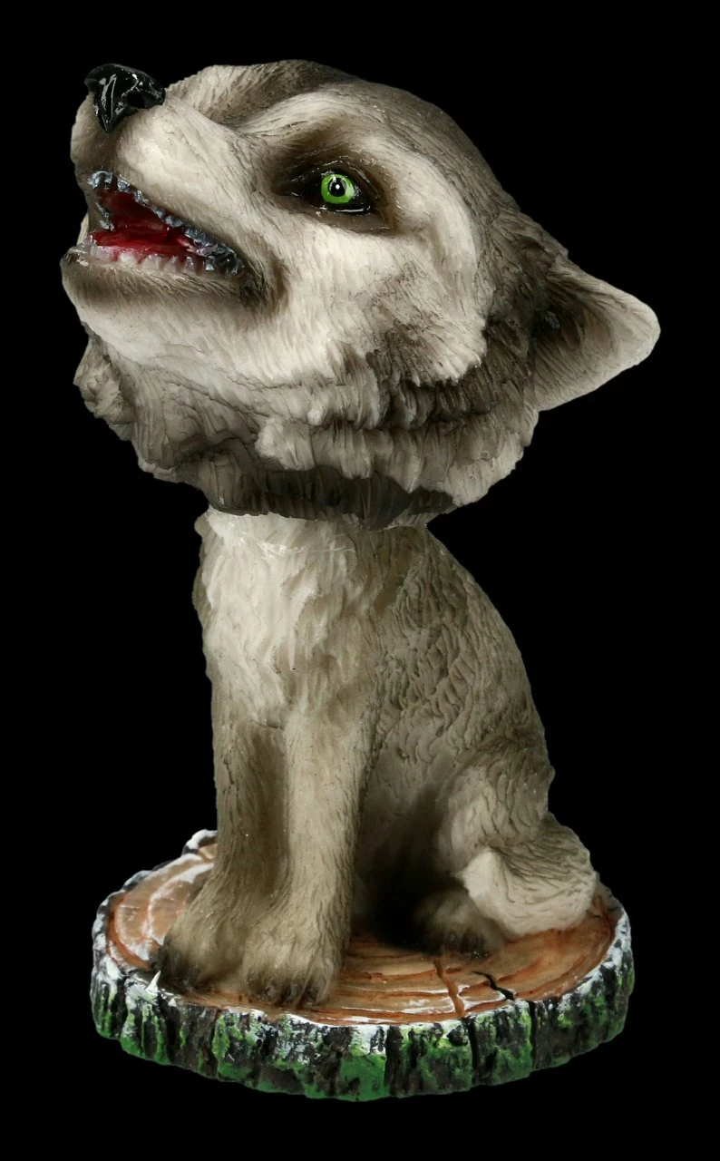Wenn man mein Heulen schon nicht hören kann, dann wackle ich halt mit meinem Kopf..Etwas verzweifelt schaut der auf einer Baumscheibe sitzende kleine heulende Wolf allerdings aus. Der niedliche Wolf mit dem großen Wackelkopf ist aus liebevoll handbemaltem Kunststein (Polyresin) gefertigt. Er ist 10 cm hoch, 5 cm breit und 6,5 cm tief und passt damit auch sehr gut in Ihr Auto und wird dort sicher jeden zum Lächeln bringen.