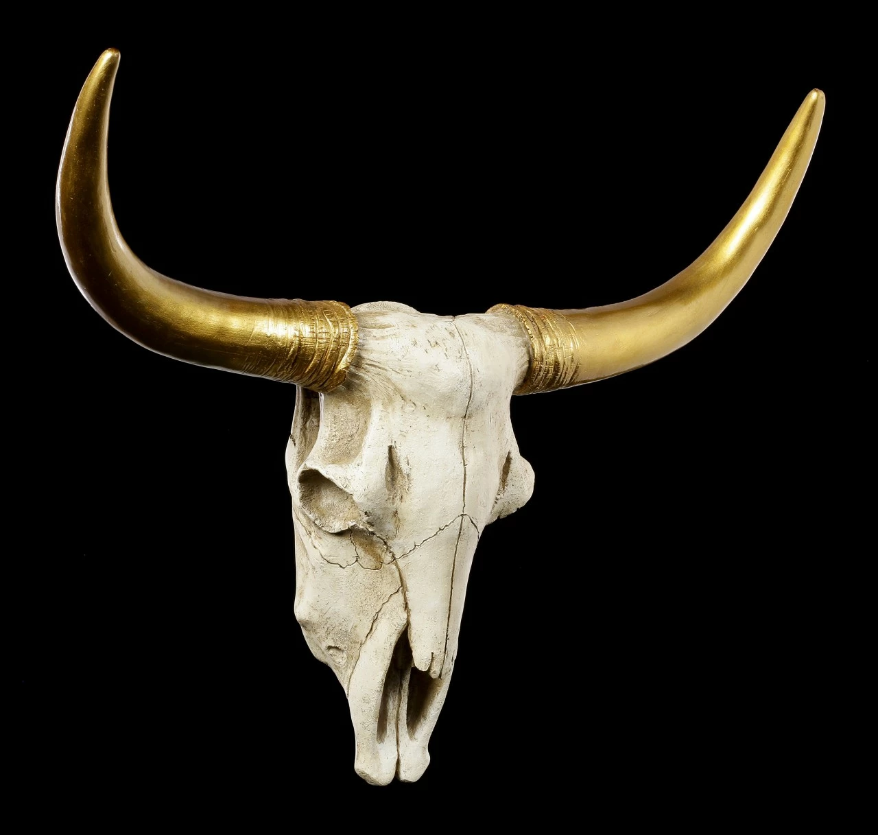 Der handbemalte Büffel Schädel mit glänzenden goldenen Hörnern ist eine wunderbare Wanddeko – nicht nur für jeden Western Fan. Der Schädel aus Kunststein (Polyresin) kann zu dekorativen Zwecken auch auf ein Sideboard gelegt werden und besticht durch die edle Bemalung.