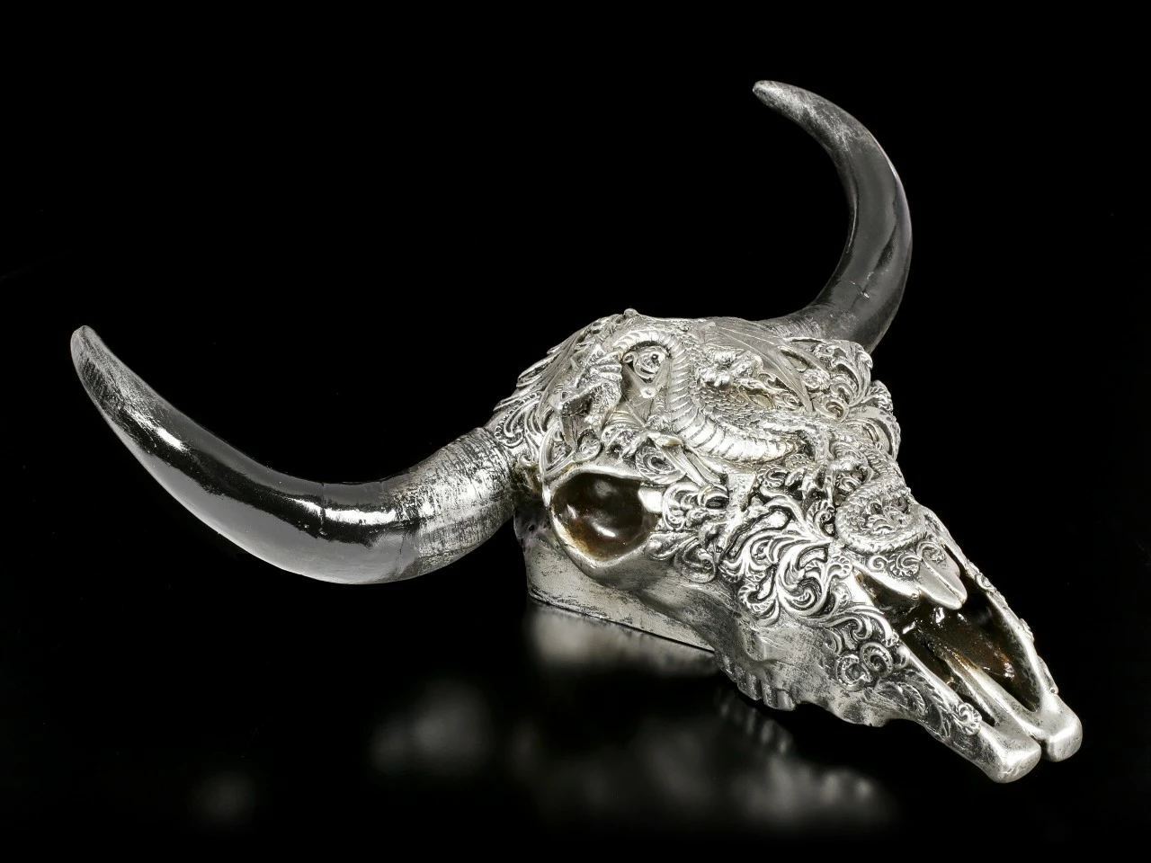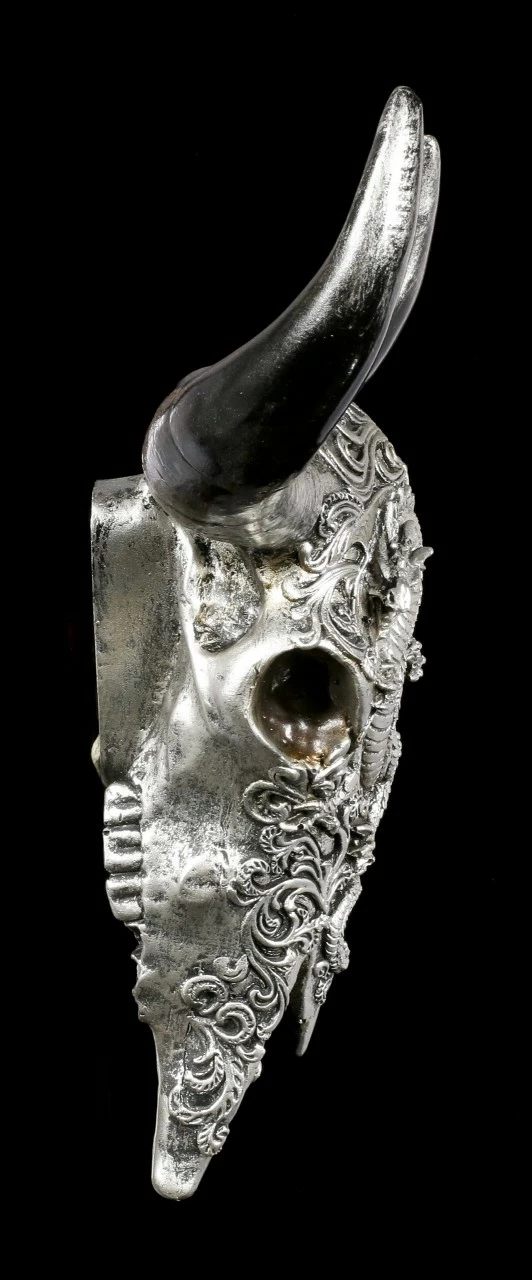 Sind Sie auf der Suche nach einer ungewöhnlichen Wanddeko? Dann ist der silberfarbene Stierschädel aus handbemaltem Kunststein (Polyresin) perfekt für Sie! Der Schädel mit Drachenmotiv lässt sich auch dekorativ auf einem Sideboard platzieren.