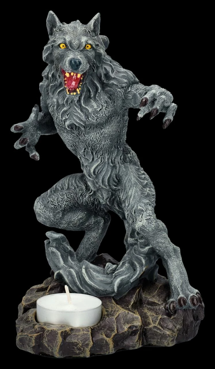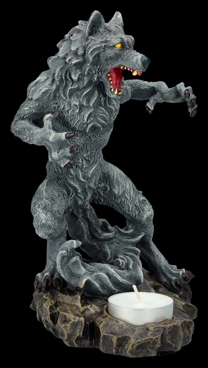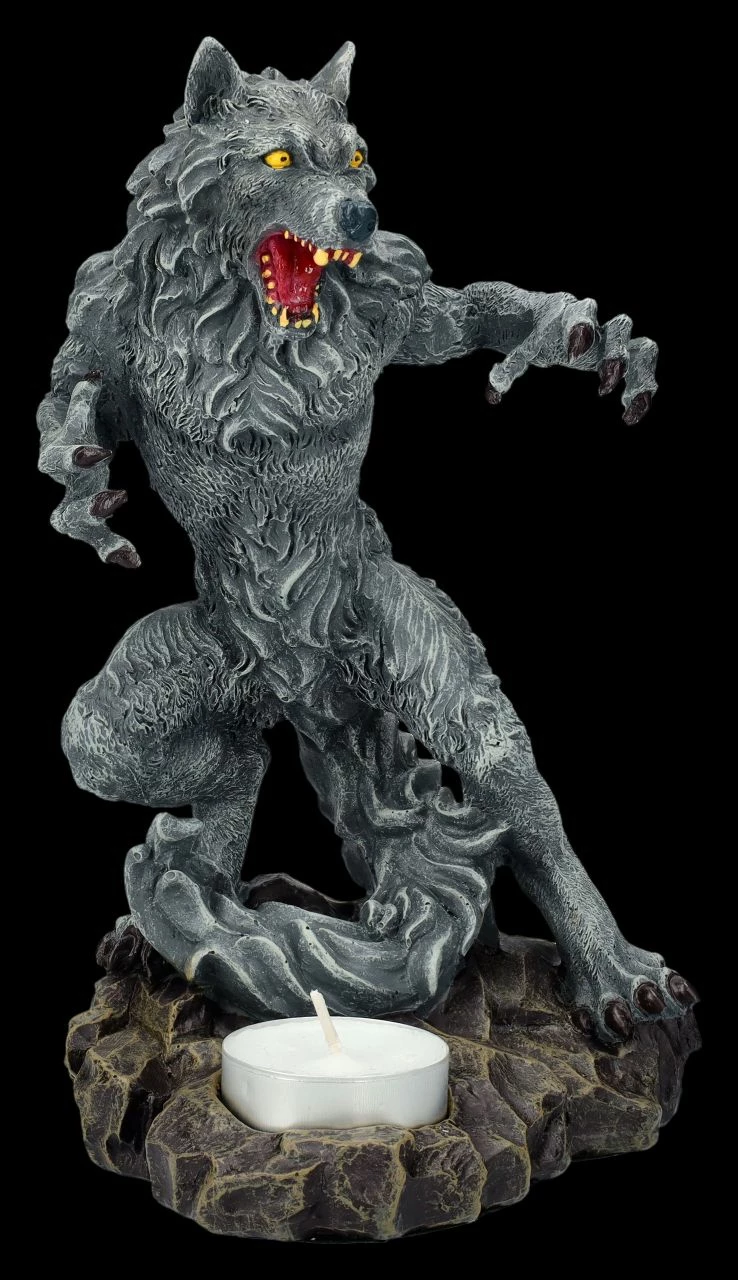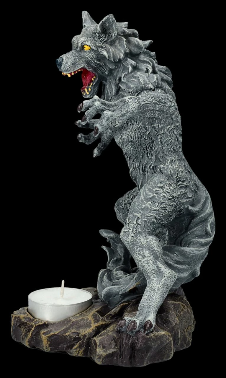 Stellt man diesen beeindruckenden Teelichthalter mit dem Werwolf geschickt auf, kann das davorstehende Teelicht gruselige Schatten an die Wand werfen und vermutlich jedem Besucher einen Schrecken einjagen. Die detailreiche 20 cm hohe, 11,5 cm breite und 12 cm tiefe aufrecht stehende, angriffslustige schwarze Werwolf-Figur aus Kunststein (Polyresin) wurde bis zu den gelben Augen und dem glühend roten Rachen mit den gelblichen Zähnen sorgfältig von Hand bemalt. Vor der Werwolf-Figur ist die Aussparung für ein Teelicht, das jedoch nicht in der Lieferung enthalten ist. Ein wahrlich tolle Deko für alle Horrorfans.