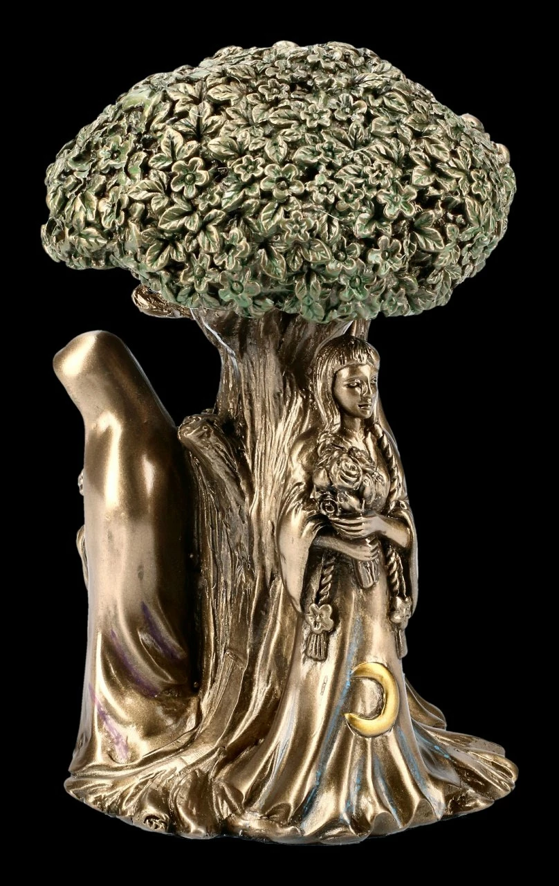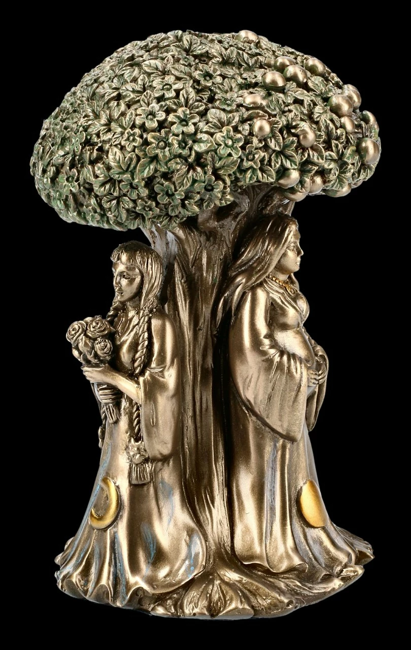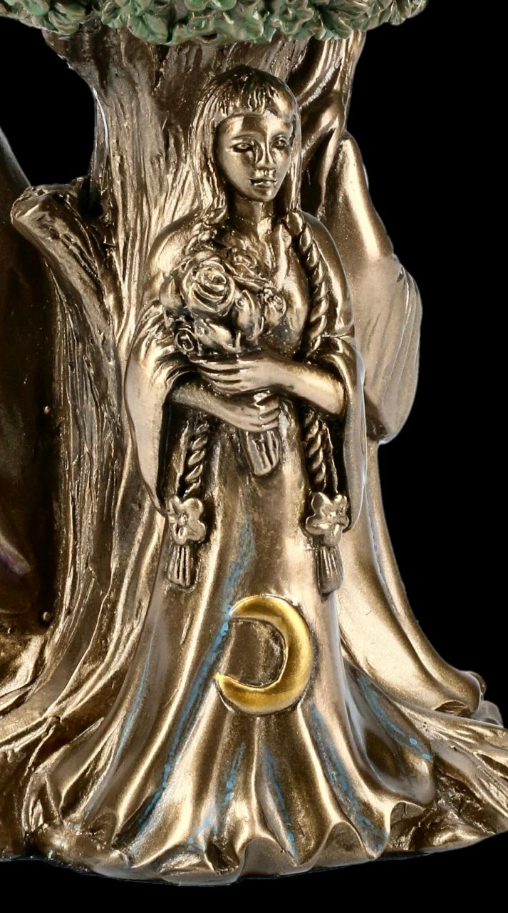 Der detailverliebte Wicca Baum Dreifaltigkeit aus sorgfältig bronziertem und coloriertem Kunststein (Polyresin) wird Sie begeistern! Der Baum zeigt mit den drei Frauen, die im Kreis um den Baum stehen, drei Lebensphasen. Die Jungfrau, die Mutter und das Alte Weib stehen zusammen für den Frühling, den Sommer und den Herbst.