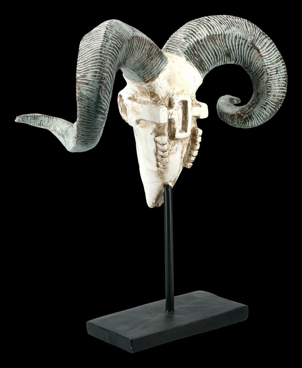 Schon bei den Kelten galt der Widder als heilig und als wichtiges Symbol. Dieser tolle gehörnte Widderschädel ist sehr detailreich aus Kunststein (Polyresin) gefertigt und mit großer Sorgfalt handbemalt. Er ist auf einem Metallständer befestigt und wirkt durch seine Silhouette sehr raffiniert und effektvoll. Der Widderschädel selbst ist 29 cm hoch. Mit seiner Gesamthöhe von 46 cm, der Breite von 42 cm und der Tiefe von 15 cm ist dieser gehörnte Widderschädel auf dem Metallständer eine ungewöhnliche Dekoration und ein toller Blickfang in jedem Wohn- oder Arbeitsbereich.