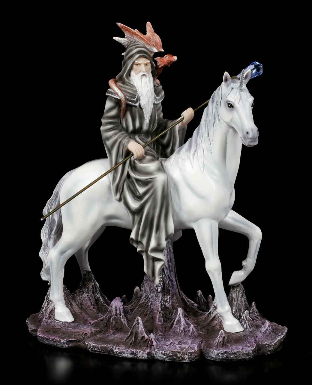 Magische Wesen sind von jeher die treuen Begleiter von Hexen und Zauberern. Der mächtige graue Zauberer hat als Reittier eines der selten gewordenen Einhörner und sein Wächter ist ein junger Feuer Drache. Der Zauberstab des Magiers ist mit einem umwerfenden Kristall verziert. Die handbemalte Figur aus Kunststein (Polyresin) sollte in keiner Sammlung fehlen.