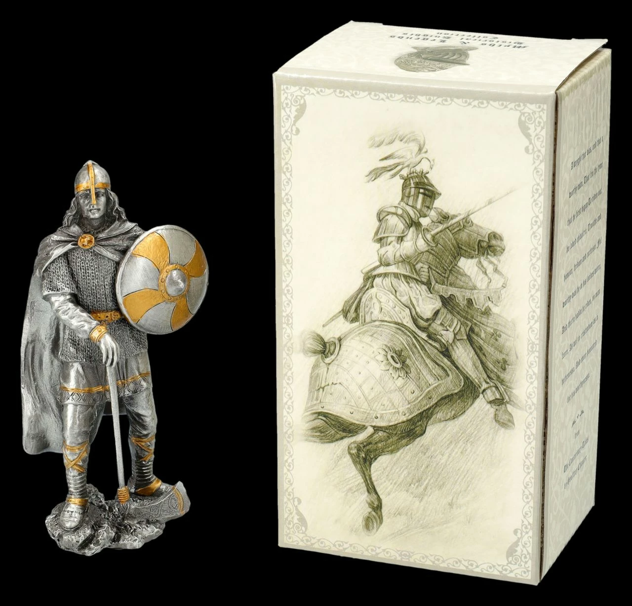 Die rechte Hand auf die Streitaxt gestützt und mit entschlossenem Blick steht dieser Wikinger in voller Rüstung auf seinen Einsatz wartend da. Mit der linken Hand hält der Wikinger sein rundes Schild hoch. Die wunderbar detailreiche Zinnffigur eines Wikingers mit Axt und Schild stammt aus der Historical Knights Collection von Veronese. Sie ist 11 cm hoch, 5 cm breit und 4,5 cm tief. und wurde mit feinen goldenen Akzenten von Hand bemalt. Sie wird inklusive Geschenkkarton verschickt und ist damit ein perfektes Geschenk für Wikingerinnen und Wikinger und natürlich für alle Sammler von Zinnfiguren..