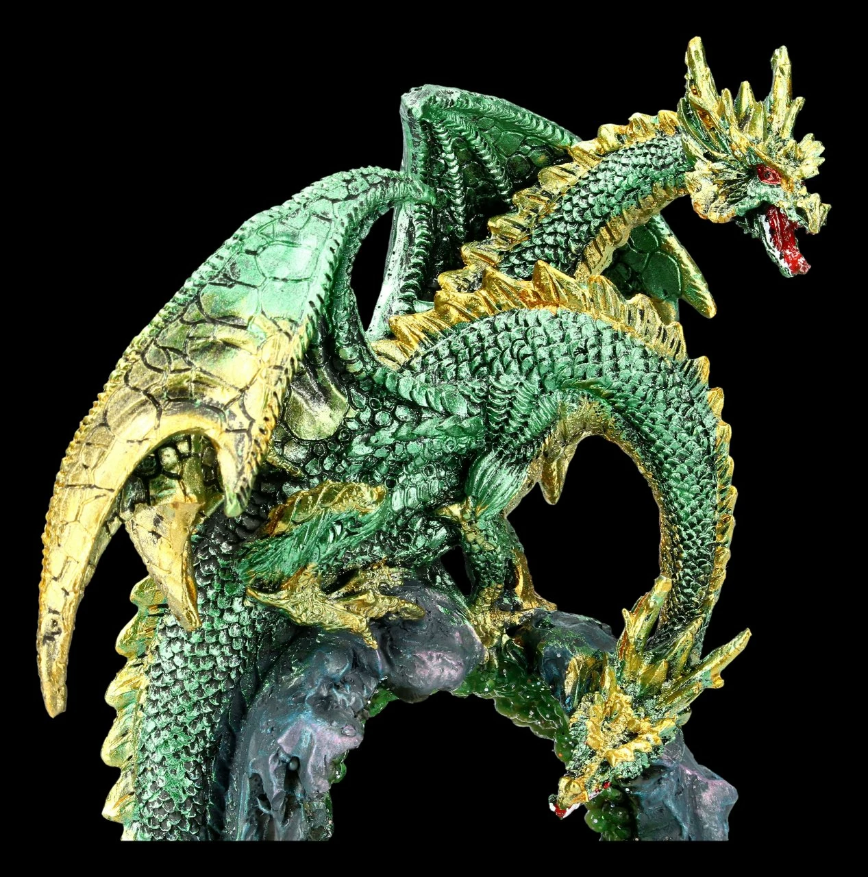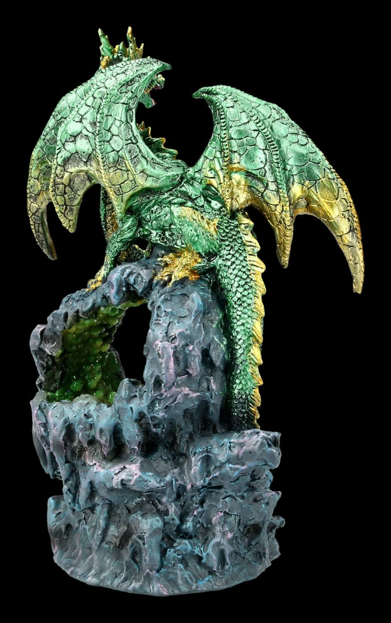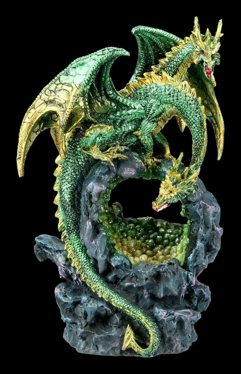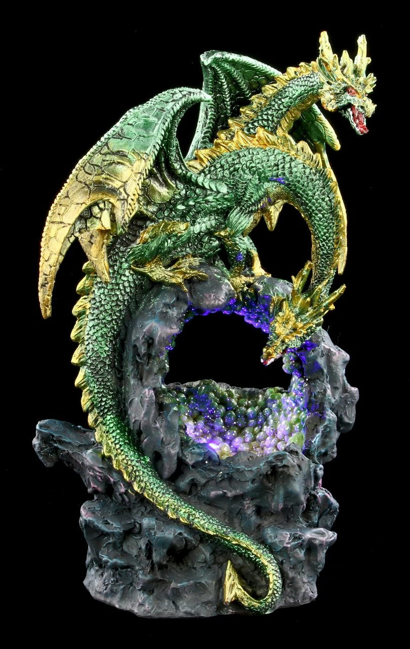Ein zweiköpfiger Drache hat sich auf den Felsen über einer mit glitzernden Edelsteinen gefüllten Höhle gesetzt. Während ein Kopf neugierig in die Höhle schaut, bewacht der andere Kopf aufmerksam die Szene. Der grüne Drache ist sorgsam handbemalt und überaus detailreich aus Kunststein (Polyresin) gefertigt. Die zweiköpfige Drachen Figur über der glitzernden Höhle ist 24 cm hoch, 14 cm breit und 11,5 cm tief. Die LED-Beleuchtung der Höhle hat einen weichen Farbwechsler und benötigt dafür 2 x AA Batterien. Die Batterien sind nicht in Lieferung enthalten. Die mit LED beleuchtete Drachen Figur ist ein effektvoller Blickfang und ein tolles Geschenk für Drachen Freunde.